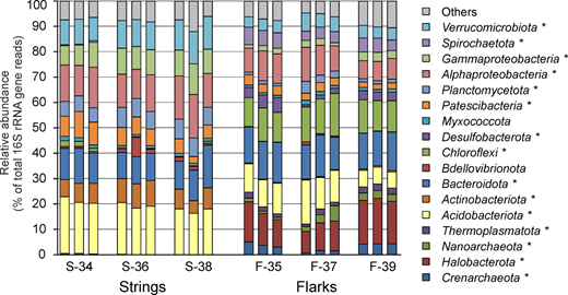 Figure 3. Prokaryotic community composition in string and flark peat samples, according to results of 16S rRNA gene profiling. Community composition is shown at the phylum level, with exception of Proteobacteria, for which classes Alpha- and Gammaproteobacteria are shown. All replicate samples (three per sampling site) are presented. Lineages with statistically significant differences (p < 0.05) in relative abundance in strings and flarks are marked with an asterisk.