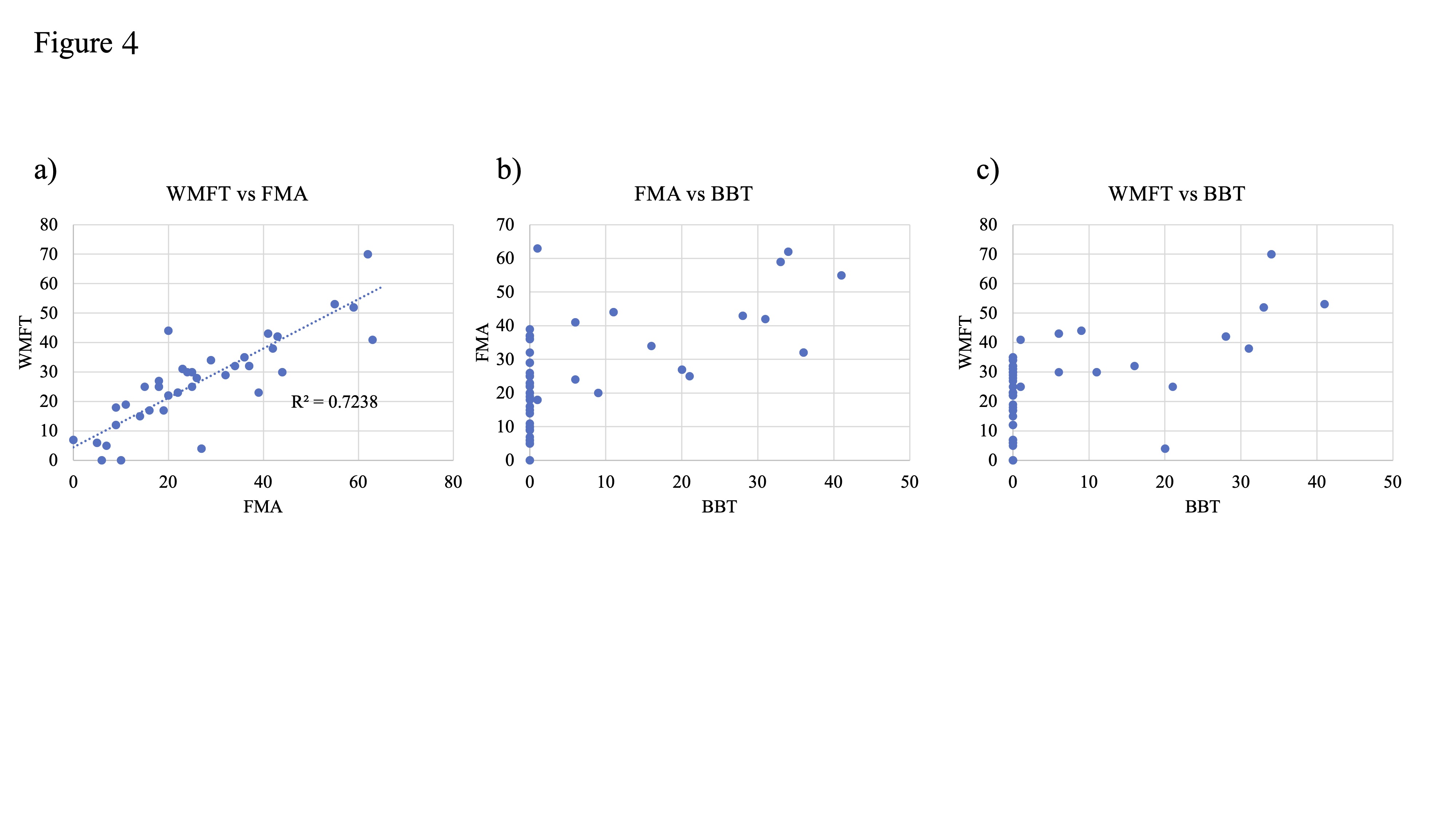 The sensitivity of outcome measures for motor function is a seemingly important factor in determining whether NMES is effective for UE function. Which of the outcome measures are the most sensitive to changes in UE function? It is likely that FMA-UE features almost the same sensitivity to severe UE paresis as WMFT-FAS (Figure 4a). BBT seemed less sensitive to UE function than FMA and WMFT (Figure 4b,c). More specifically, BBT marked zero even when the FMA scores and WMFT were estimated as 40 and 35, respectively. Accordingly, it is plausible that the included studies used FMA most frequently as outcome measures for motor recovery when applying NMES. It is notable, however, that full FMA-UE scores do not mean full recovery from paresis. For patients with mild paresis, FMA is saturated. Instead, BBT is available. This means that the sensitivity and suitability of outcome measures may depend on stroke severity. In the near future, a new universal outcome measure, independent of the severity of UE paresis, is expected to be established.