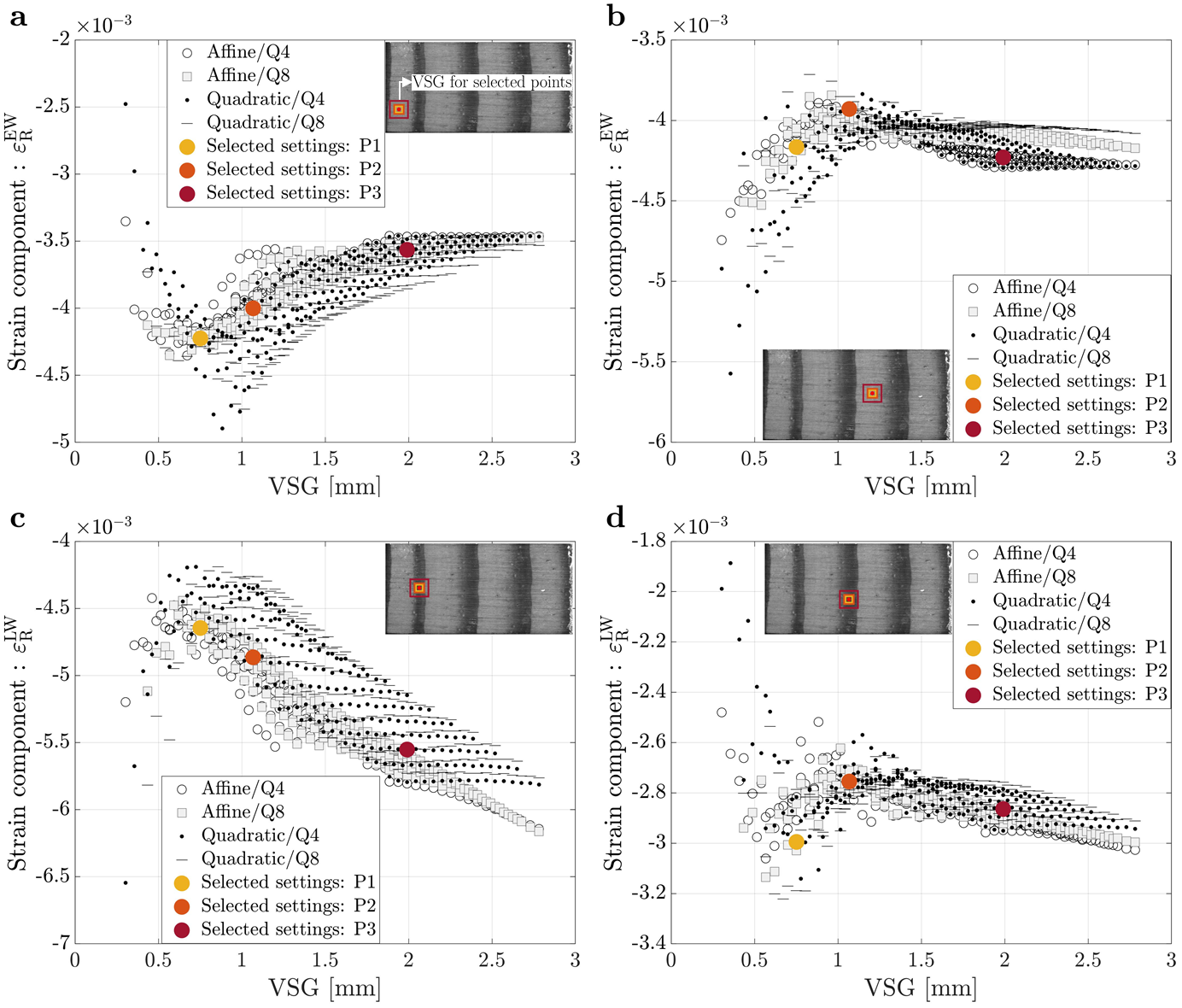 The sets of different DIC settings tested correspond to a virtual strain gauge (VSG) range between 23 and 211 pixels, or approximately 0.3 to 2.79 mm. The convergence study performed for the on- axis and off-axis specimens is summarized in Figures 2 and 3, respectively, by comparing the signal measured of the strain component on the radial direction (εR) for the on-axis specimen and on the x direction (εxx) for the off-axis specimen, with the VSG size at four different points: (a) two earlywood points and (b) two latewood points.