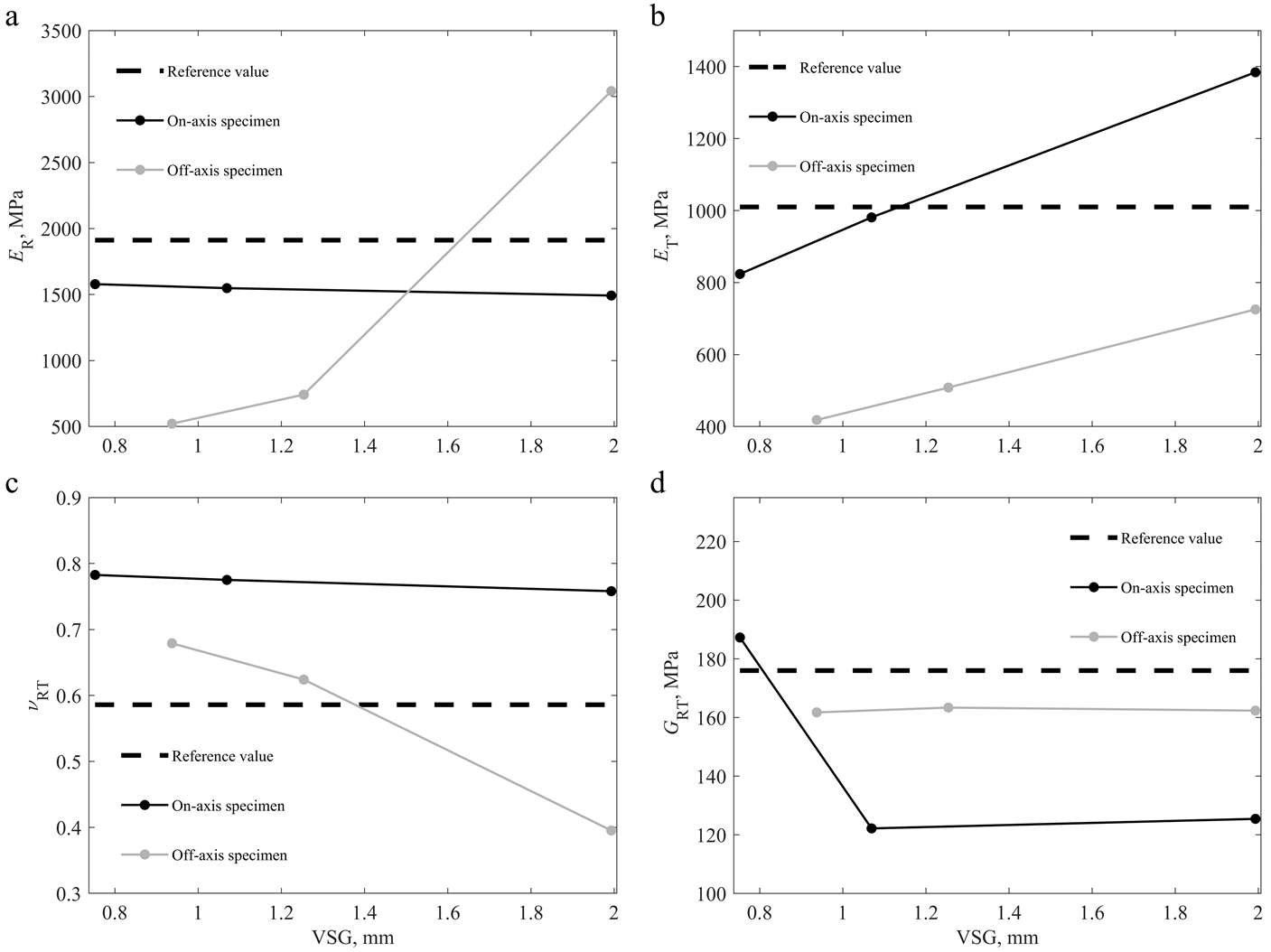 Figure 5. Results for the identification process for an on-axis and off-axis specimens using three different DIC settings (Table 1), and compared to the reference values [2][39], regarding the identified parameters: (a) ER; (b) ET; (c) νRT; (d) GRT.On the on-axis specimen, the variation of the ER and νRT appears to be small as the VSG size increases. However, on the off-axis specimen, the variation for these parameters appears to be larger as the VSG size changes. On the other hand, the variation of GRT is lower on the off-axis specimen and higher on the on-axis specimen, whereas the ET varies almost linearly on both specimen configurations. Theoretically, the modulus of elasticity in the radial direction (ER) is the parameter with the most identifiability on the on-axis specimen, given the test configuration used. Similarly, the shear modulus of the RT plane (GRT) is, theoretically, the most identifiable parameter for the off-axis specimen. These results suggest that DIC settings have less impact on parameters with high identifiability.