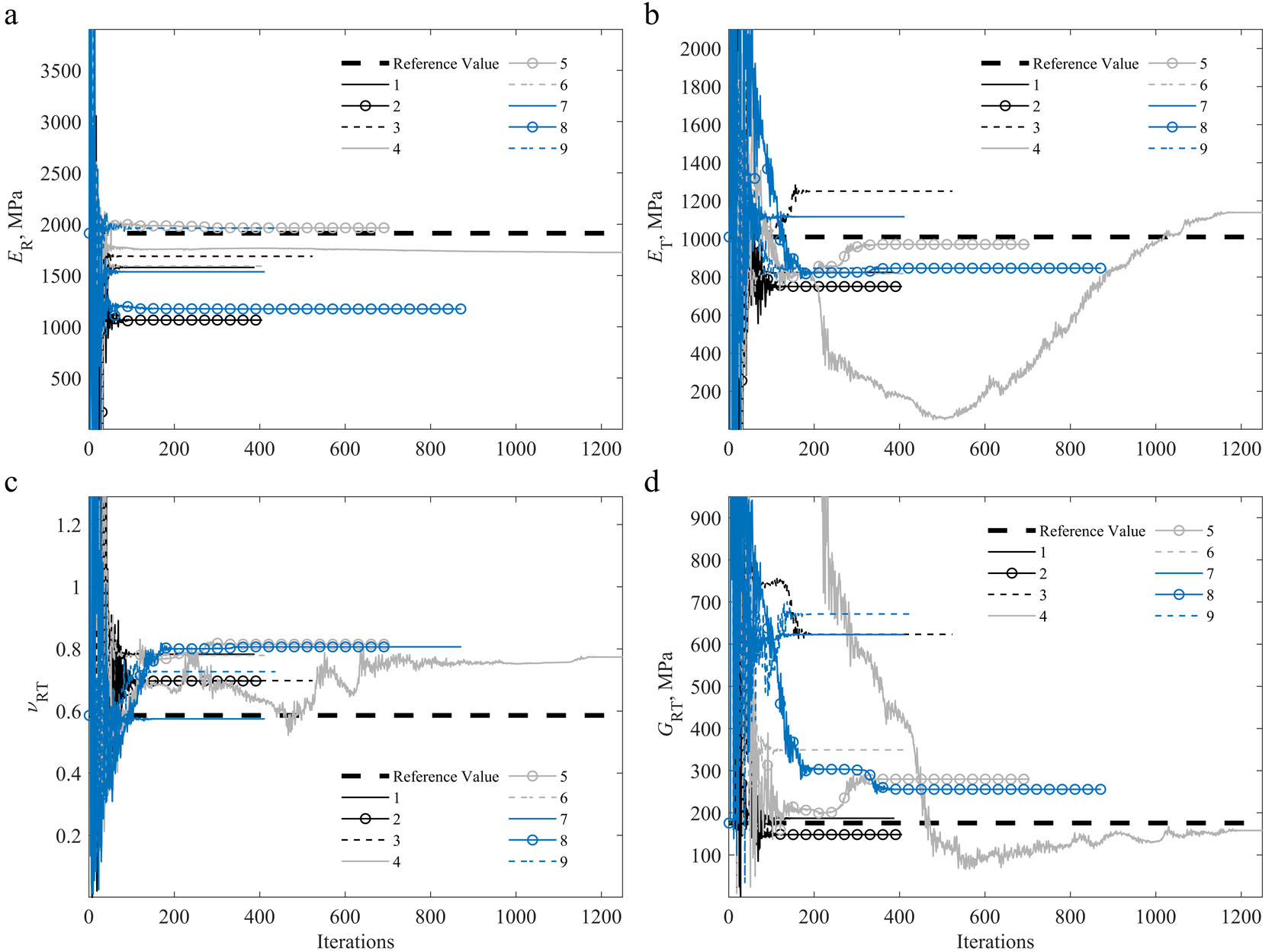 Figure 6. Convergence of the identified parameters for the on-axis (1–9) specimens during the iterative procedure, compared to the reference values [2][39]: (a) ER; (b) ET; (c) νRT; (d) GRT.