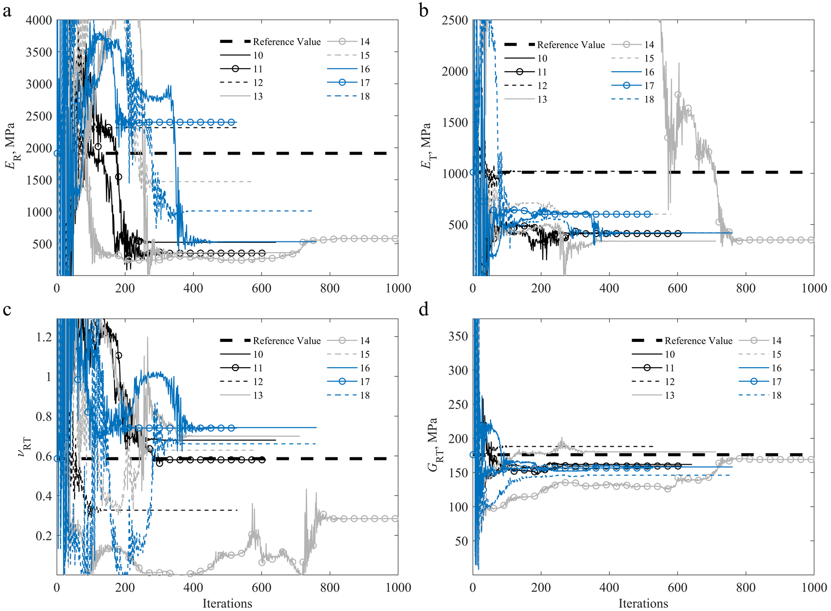 Figure 7. Convergence of the identified parameters for the off-axis (10–18) specimens during the iterative procedure, compared to the reference values [2][39]: (a) ER; (b) ET; (c) νRT; (d) GRT.