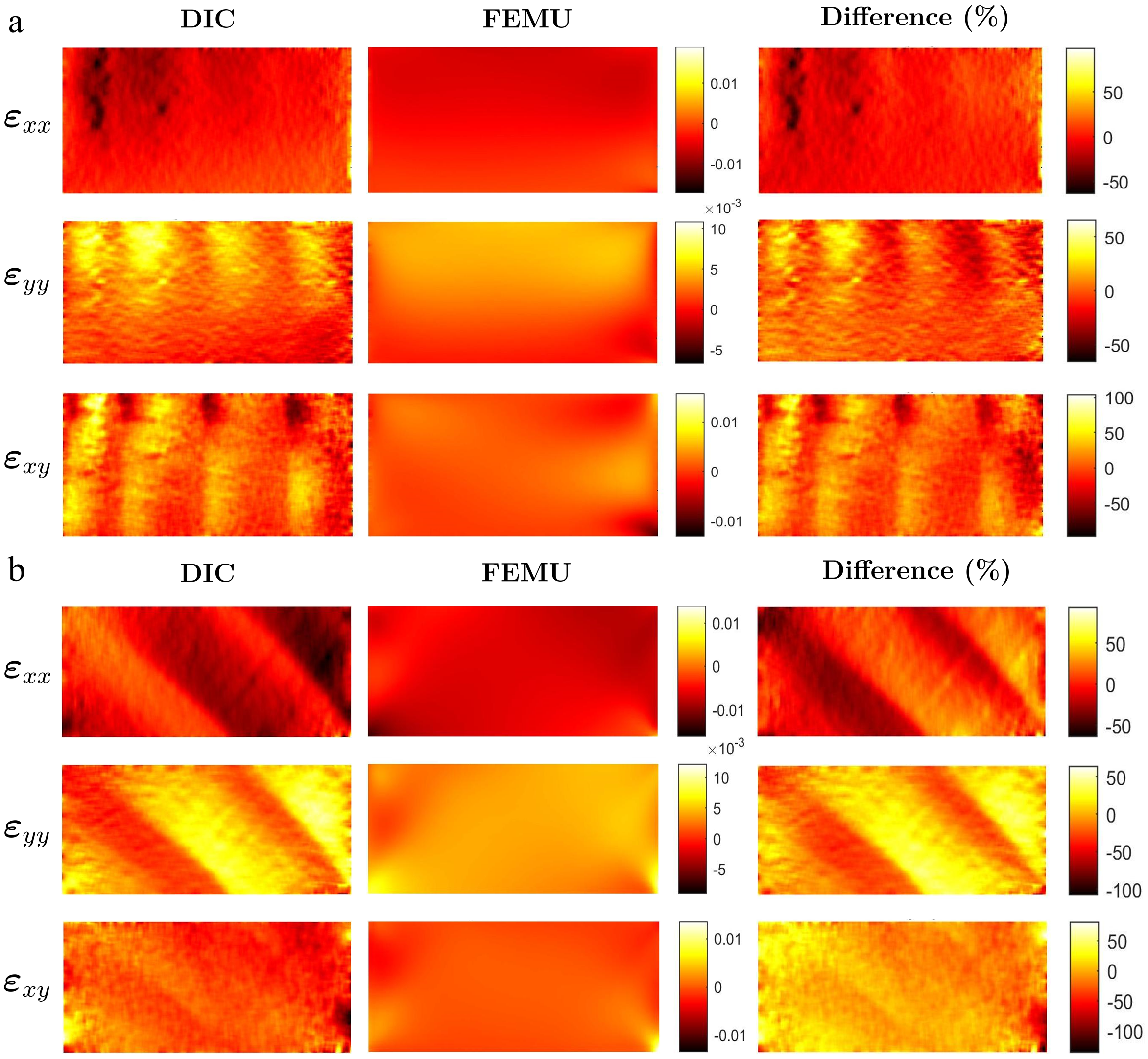 Figure 8. Experimental calibrated numerical and difference full-field strain maps for: (a) Specimen 1 and (b) Specimen 17.