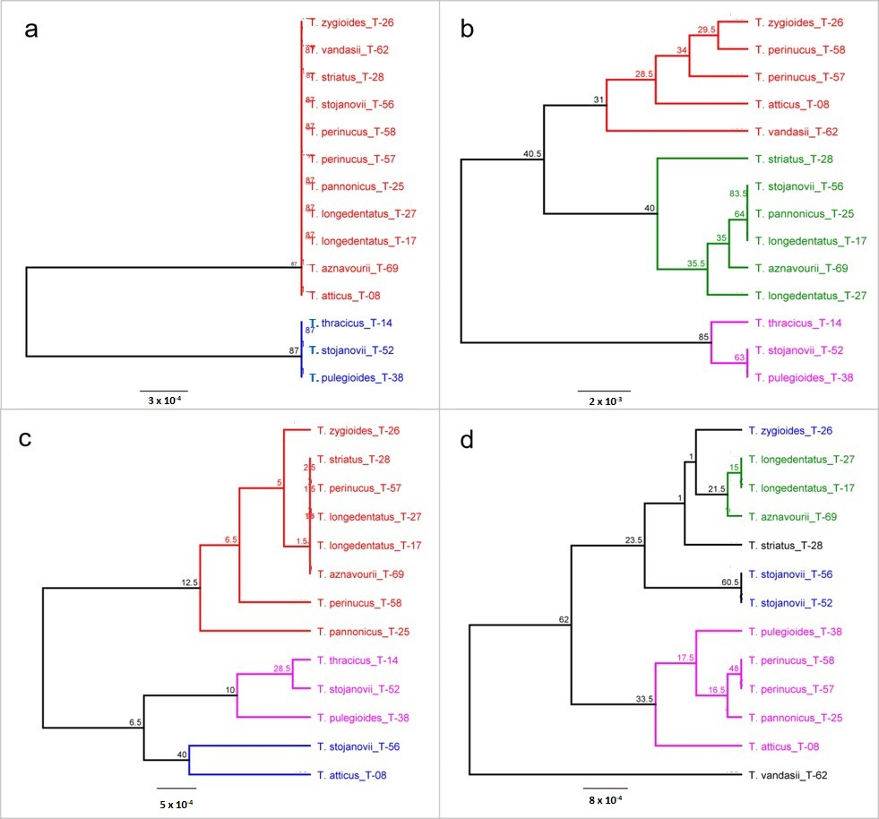 Figure 1. Phylogenetic trees of Thymus taxa constructed based on barcode regions rbcL (a), trnH-psbA (b), matK (c) and ITS (d). The trees were constructed using the Geneious software with the genetic distance model Jukes–Cantor, the unweighted pair group method with averages UPGMA clustering method and the resampling method bootstrap with 200 replicates. Bootstrap values > 50% are shown along the branches.