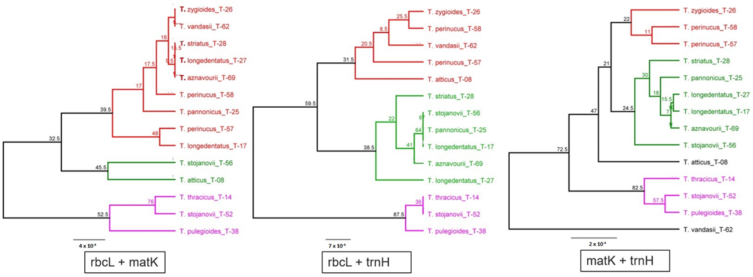 The other region (trnH-psbA) showed the highest level of genetic divergence (Figure 1c). Three main groups were formed—two small and a bigger one. The first small group consisted of three species belonging to section Hyphodromi, and the second one combined species of section Serpyllum—similarly to rbcL tree topology. The larger group consisted of three species of section Serpyllum and two of section Hyphodromi. One species—T. vandasii—had a somewhat distinct position.