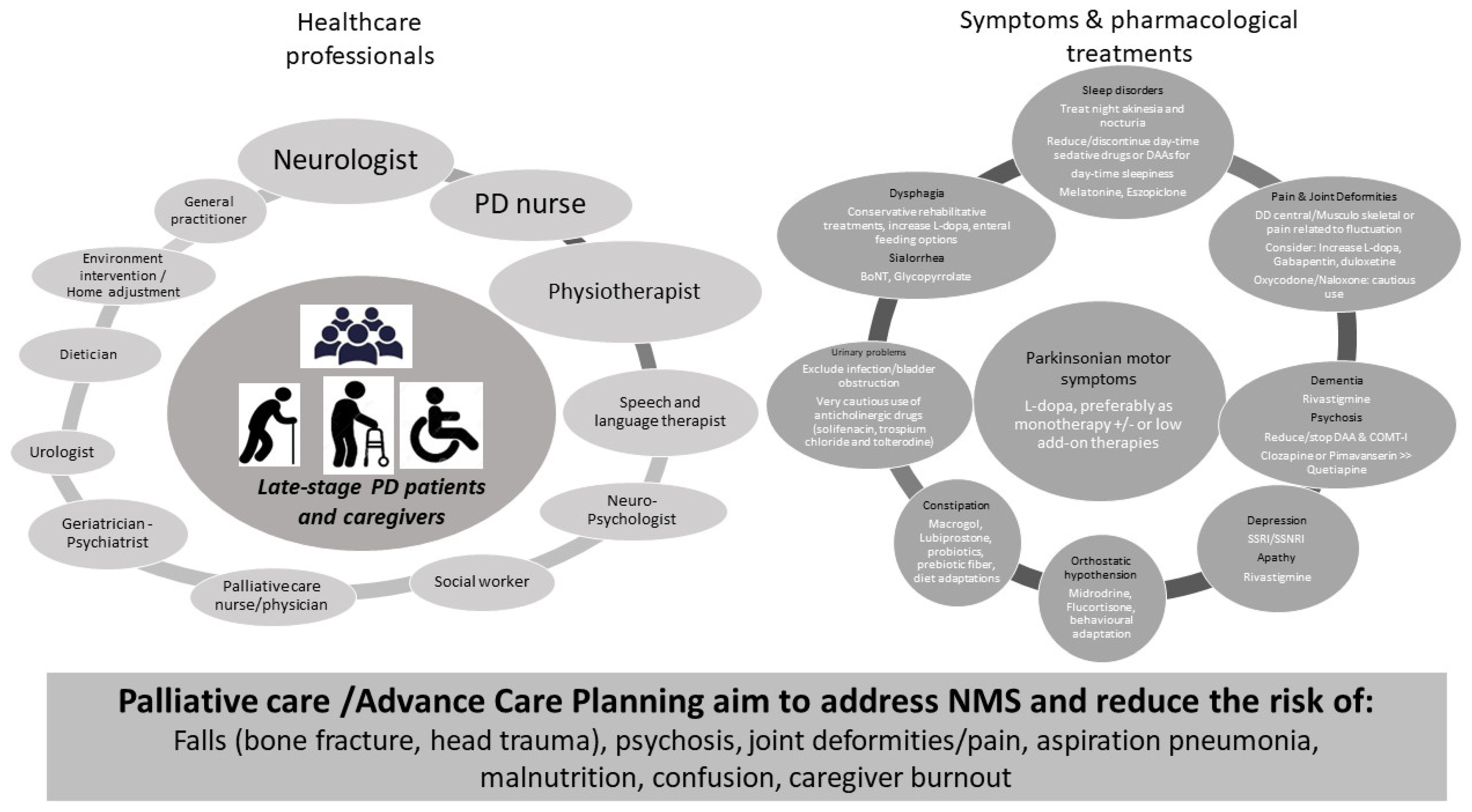 Figure 1. Pillars for Late-stage PD treatment. Left panel: health care professionals involved in LSPD management. Right panel: motor and NMS and available pharmacological options. Bottom: the main objectives of prevention strategies for LSPD patients. COMT−I: Catechol−O-methyl transferase inhibitors; DAAs: dopamine-agonist; SSRI/SNRI: selective serotonin reuptake inhibitor/serotonin and norepinephrine reuptake inhibitor.