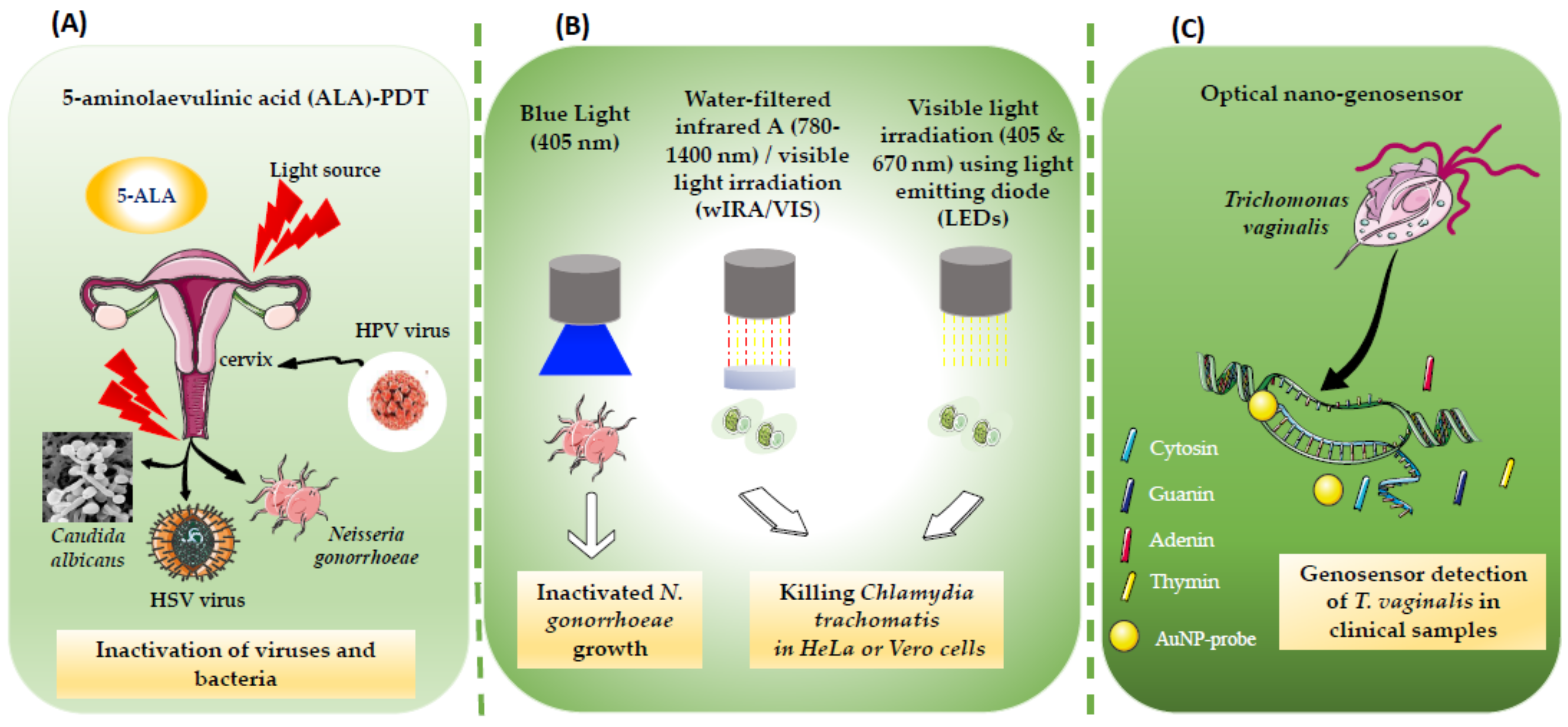 Drug resistance is increasingly observed in pathogens causing STIs. Clinical trials have used some physical therapy approaches that do not cause resistance. In this research, researchers are particularly interested in the treatment of STIs by phototherapy (PT). PT is a major therapeutic approach based on the controlled administration of light in the visible, near infrared, or UV spectrum, with or without the application of an external photosensitizer. When the light is combined with a photosensitizer, it is called photodynamic therapy (PDT). PDT is a physicochemical method initially developed to treat cancer and tumors