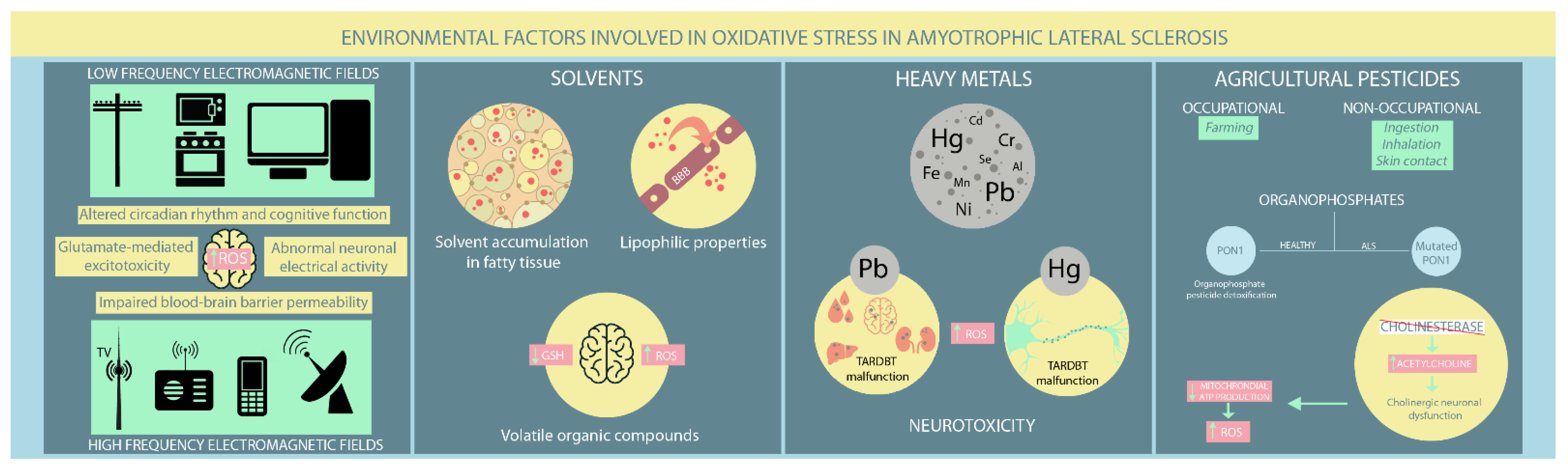 Already recognised and exhaustively studied mutations can no longer thoroughly explain ALS pathogenesis. Exposure to various environmental factors, such as EMFs, solvents, heavy metals, and agricultural pesticides, has been hypothesised to contribute to ALS pathogenesis. Nevertheless, the contribution of several occupational factors to ALS has proven difficult to assess since there are no clear signs indicative of ALS development in ostensibly healthy individuals. Therefore, exposure to various environmental factors is based solely on patient recollection, and existing studies have provided controversial evidence that has not clarified the role of environmental factors in ALS (Figure 2).