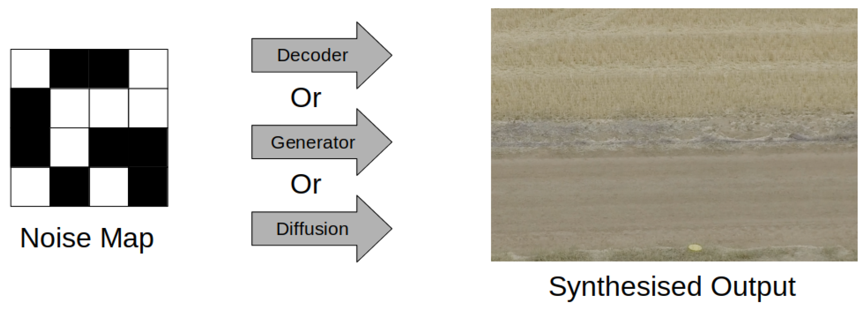 The last type of synthetic composite imagery is less so an image composite and more of an extreme extension to digital manipulation. Images synthesised using variational autoencoders, generative adversarial networks, and diffusion models use noise maps as inputs to generate an image, Figure 4. By learning compressed representations of images, noise maps can be used by these models to extrapolate features into a complete image.