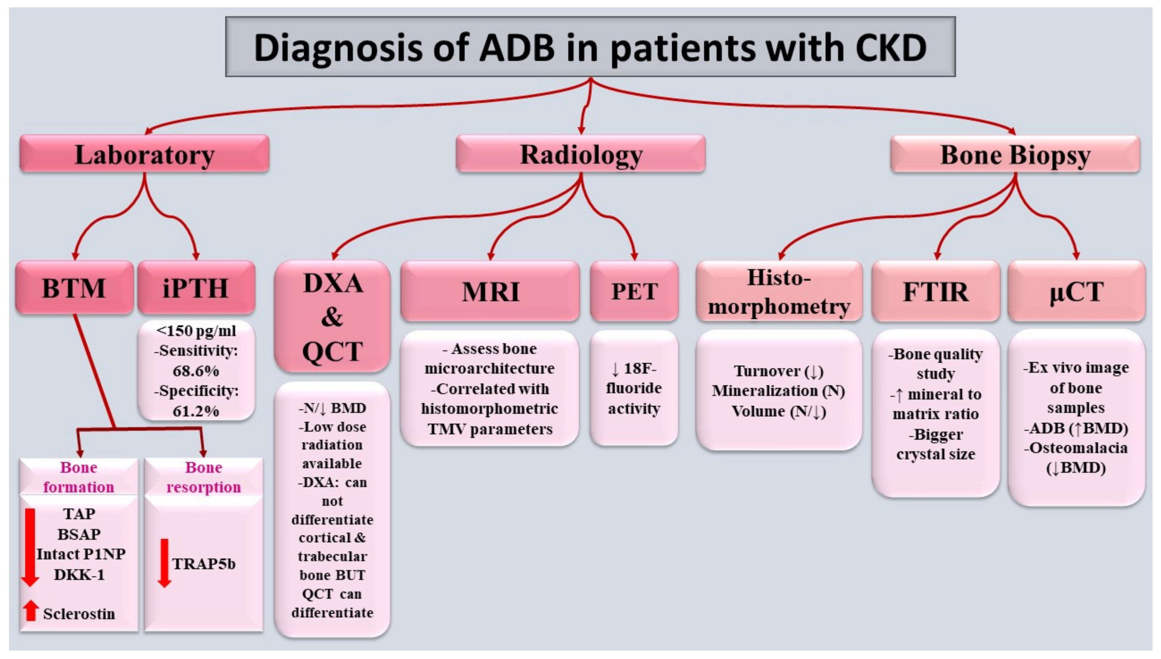 Figure 2: Diagnosis of ADB in patients with CKD. Diagnosis mainly relies on bone biopsy, gold standard, as well as reduced bone formation & bone resorption markers. ADB: adynamic bone, BSAP: bone specific alkaline phosphatase, BMD: bone mineral density, BTM: bone turnover markers, CKD: chronic kidney disease, DKK-1: Dickkopf-related protein-1, DXA: Dual-energy x-ray absorptiometry, FTIR: Fourier-transform infrared spectroscopy, iPTH: intact parathyroid hormone, MRI: Magnetic resonance imaging, P1NP: Procollagen type 1 N-terminal pro peptide, PET: Positron emission tomography,QCT: Quantitative computed tomography, TAP: total alkaline phosphatase, TMV: turnover/mineralization/volume, TRAP 5B: tartrate resistant acid phosphatase 5b, μCT: Micro-Computed Tomography
