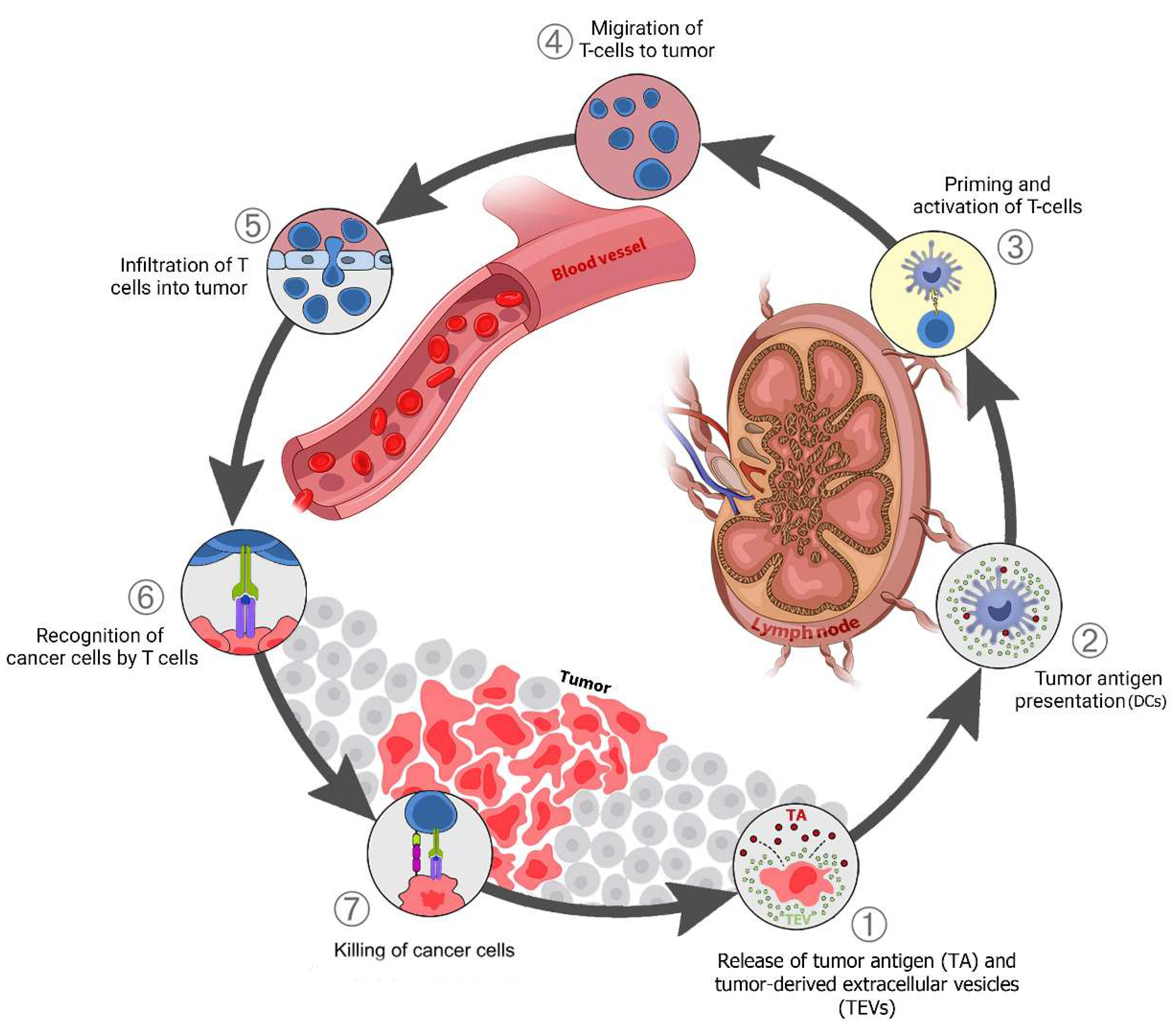 Figure 1. TEV in the cancer-immunity cycle: (1) Release of tumor antigens (TAs) along with tumor-derived extracellular vesicles (TEVs) that carry TA + DAMPs from dying cancer cells; (2) Presentation of TAs on the major histocompatibility complex (MHC) by dendritic cells; (3) T-cell receptor recognition of TAs on the MHC, leading to T-cell activation; (4) Migration of activated T cells to the tumors; (5) T-cell infiltration into the tumor; (6) Recognition of cancer antigens within the tumor; (7) Attack and killing of tumor cells.