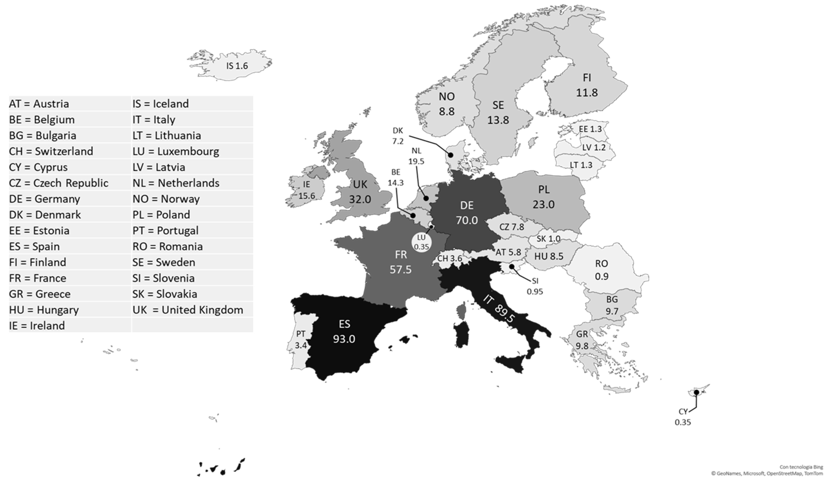 Figure 3. European film sales by country in 2018 expressed as thousands of tons. The darkness of each country in the map is proportional to the mass of plastic films sold. The two-letter abbreviations of country names are in accordance with the ISO 3166-1 alpha-2 standard. Source: APE Europe [13].