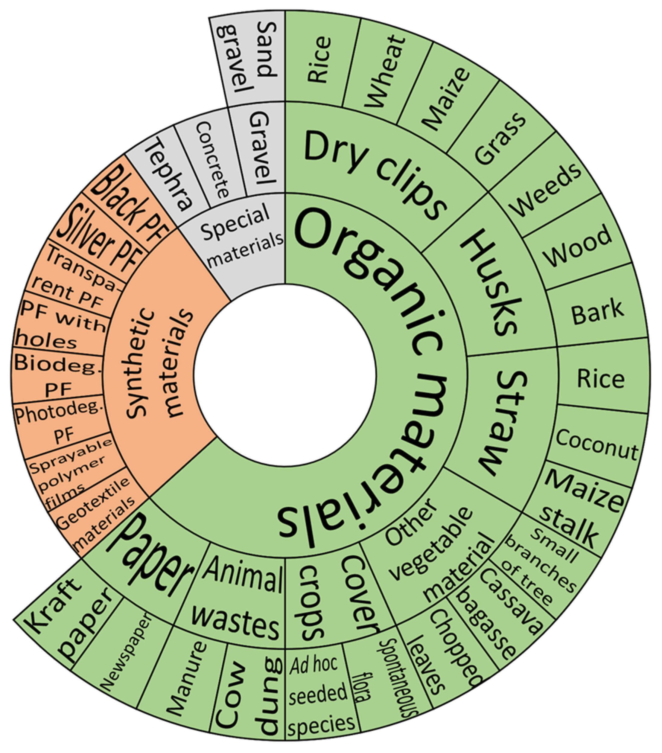 Mulches can be defined as materials that are applied or grow on the soil surface (the latter are the living mulches), in contrast to soil-incorporated materials [14]. They may provide many services to the soil: improvement of moisture content, reduction in soil compaction and erosion, mitigation of temperature excesses and defects, and improvement to plant establishment and growth [15][16]. Not to mention, organic and living mulches can improve soil nutrition, degrade pesticides, and reduce weed pressure [14][17][18][19][20]. Mulching materials can be classified into three types: organic materials (products of vegetable or animal origin), synthetic materials, and special materials (e.g., gravel); they can be used in combination, based on the specific aims [21]. Figure 4 shows the variety of mulches in relation to the material they are made of. There are a great number of organic mulches, and these include agricultural and industrial wastes, as well as living mulches. Synthetic mulches include several types of plastic films (Figure 4), even biodegradable and photodegradable ones [22], as well as spray-degradable polymer films (Figure 4), which are very versatile and easy to apply in the field.