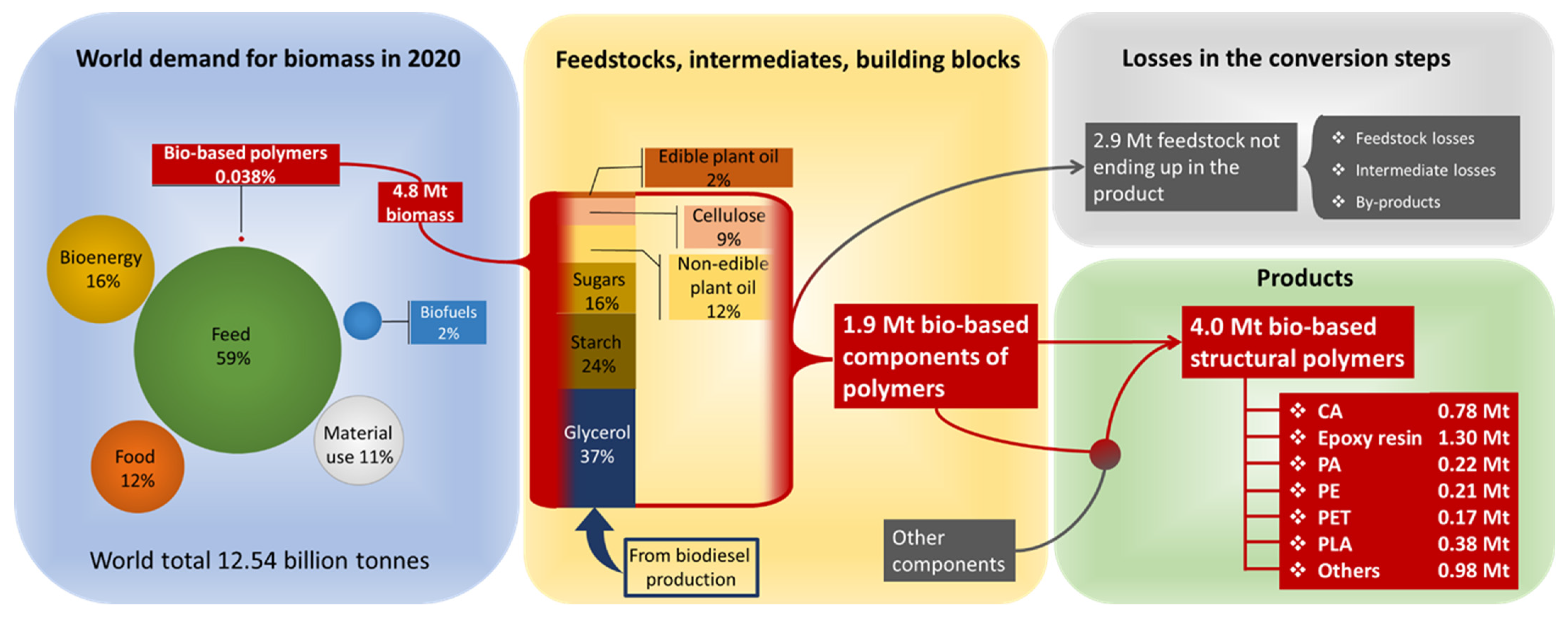 Figure 6. Diagram of the relationships between the biomass to produce bio-based polymers and bio-based structural polymers produced worldwide in 2020. Modified and adapted from Carus [42]. CA: cellulose acetate; PA: polyamide; PE: polyethylene; PET: polyethylene terephthalate; PLA: polylactic acid.