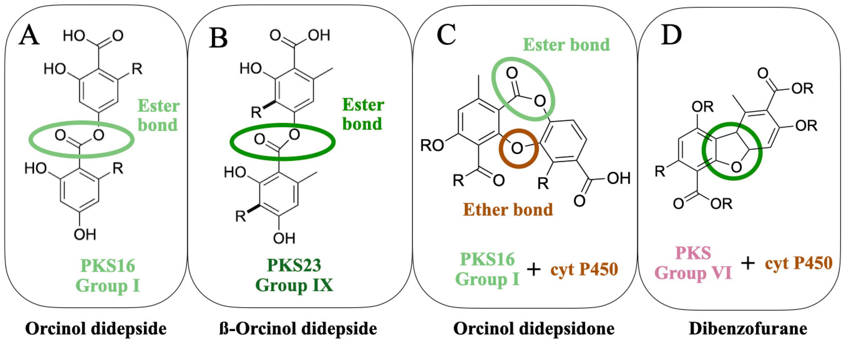 Figure 1. The molecular structures of four classes of lichen compounds linked to the genes. The colored circles denote the characteristic bond of a compound-ester bond present in a depside (A), the ester bond of a ß-orcinol depside (B), the ester and ether bond present in a depsidone (C), and the characteristic dibenzofurane bond (D).