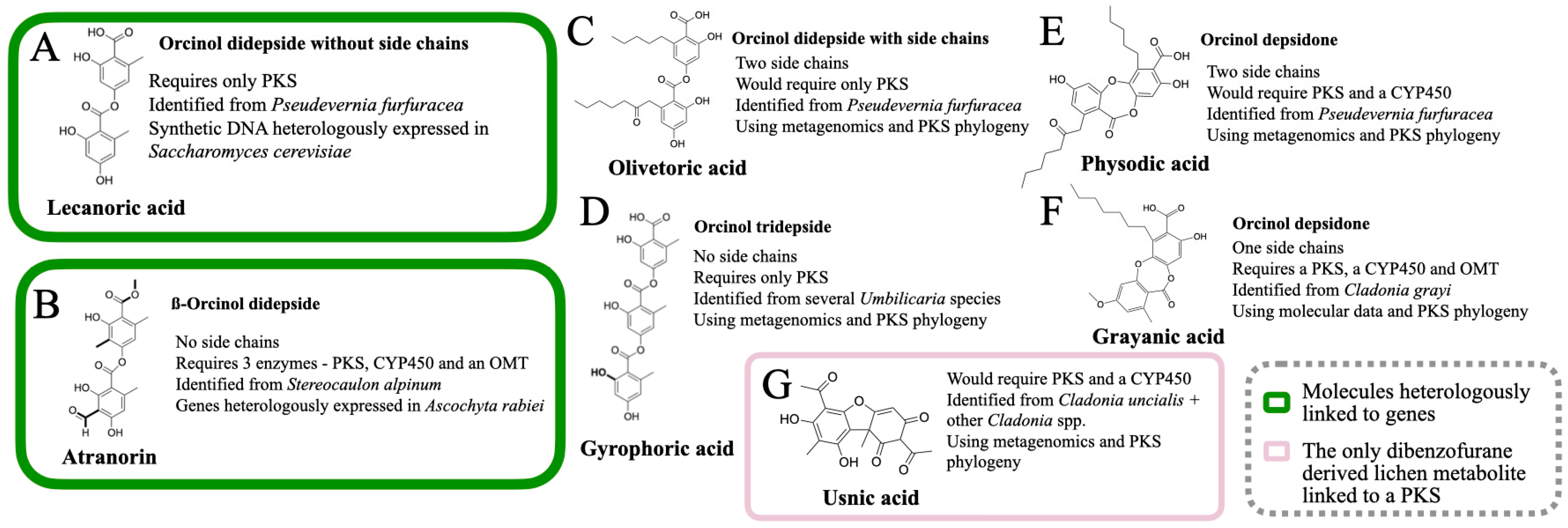 Figure 2. The lichen compounds that are linked to a PKS. The compounds highlighted in green are the ones in which the link between the molecule and the PKS was also verified by heterologous expression. (A) lecanoric acid, (B) atranorin, (C) olivetoric acid (D) gyrophoric acid, (E) physodic acid, (F) grayanic acid and (G) usnic acid.