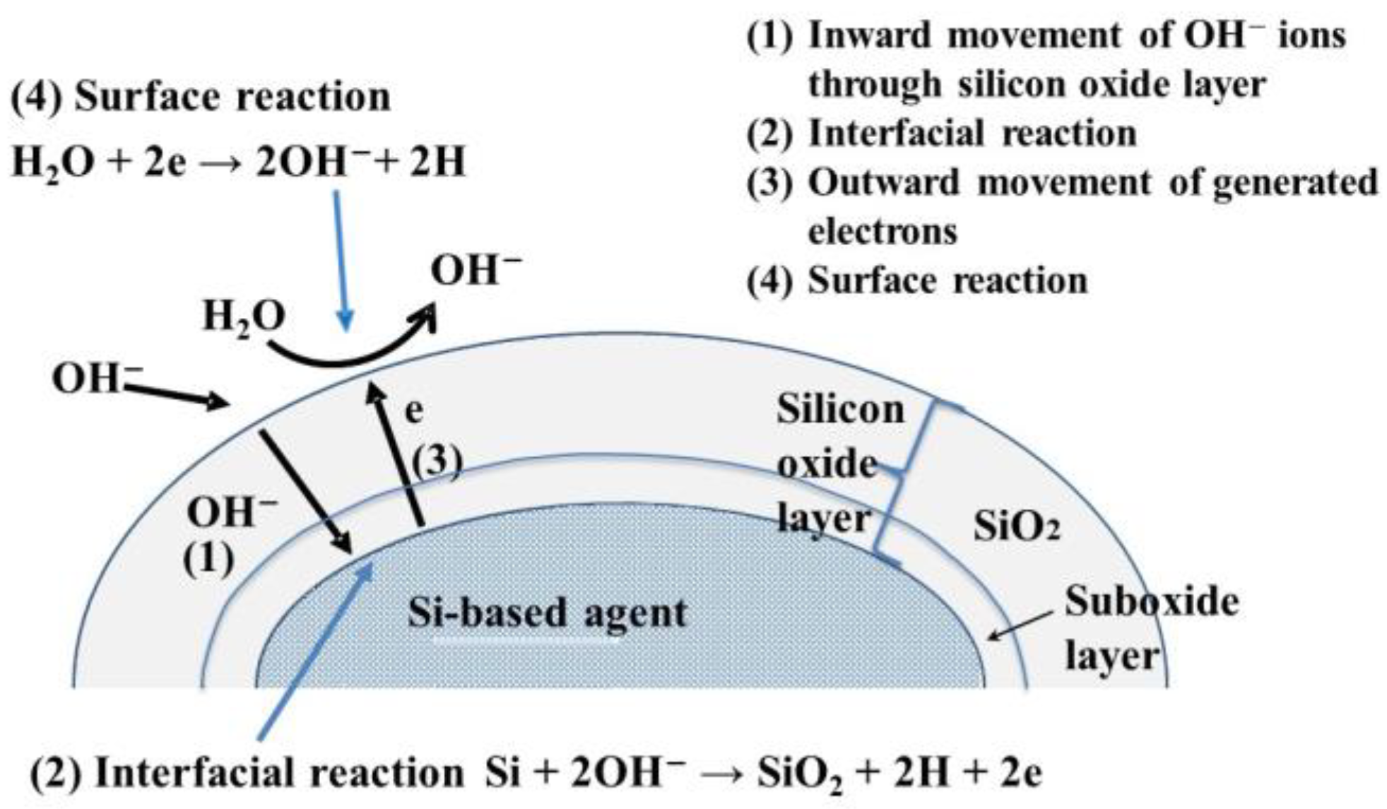 Figure 3 shows the mechanism of hydrogen generation using a Si-based agent. Before the reaction, the Si-based agent was covered with a silicon oxide layer 1–2 nm thick, and this thickness increased as the hydrogen generation reaction proceeded (cf. Reaction (3)) [24]. In the first reaction step, OH- ions move inward through the silicon oxide layer. The inward movement of OH- ions is enhanced by the electrical field induced by the OH- ions adsorbed on the surface of the silicon oxide layer [20]. In the second step, interface Reaction (3) proceeds when OH- ions reach the Si-based agent/silicon oxide interface. The interfacial reactions involve four elementary reactions [25].