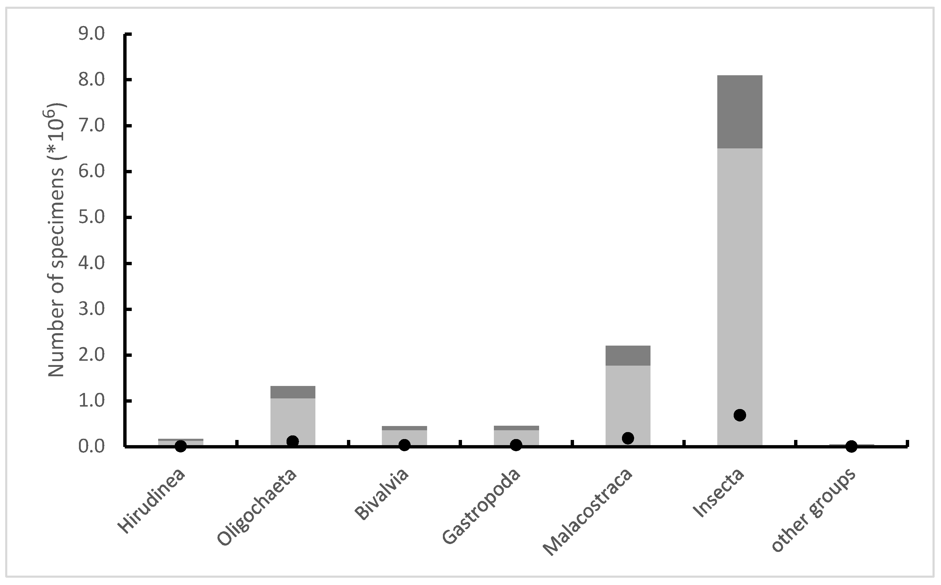 Figure 1. Estimated number of animals from the most important taxonomic groups that were killed during sampling for the purposes of biomonitoring in Polish watercourses in 2012–2019, with the number of specimens used for the analysis (dark grey) and the number of individuals necessary for the correct analysis (black dots) shown.
