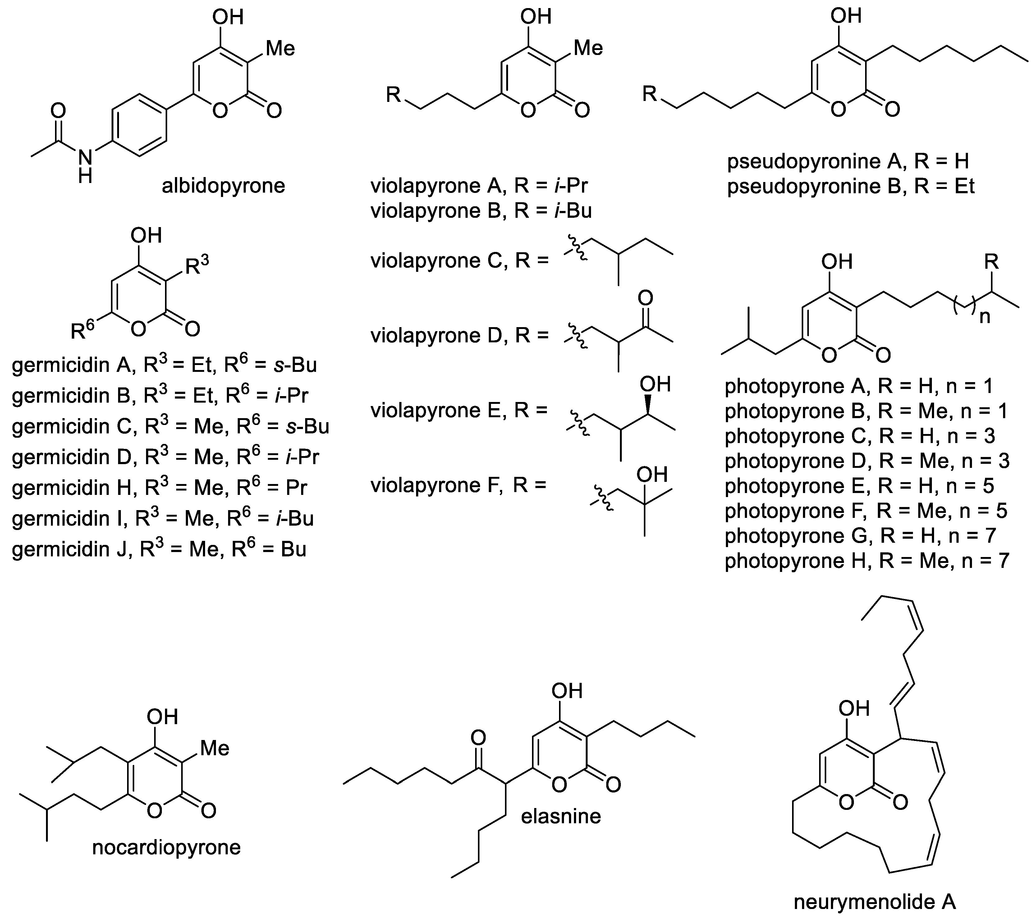 The most common class of natural 4-hydroxy-2-pyrones includes 3-alkyl-substituted molecules, which contain alkyl and alkenyl substituents at the C-6 position and less often substituents at the C-5 position (Figure 3). A large class includes germicidins A–J as important representatives of 3,6-dialkyl-substituted 4-hydroxy-2-pyrones [35]. These compounds are natural antibiotics that were isolated from Streptomyces bacteria and are responsible for spore germination via inhibition of porcine Na+/K+-activated ATPase [36]. Related molecules are violapyrones A–F, which bear the methyl substituent at the C-3 position and a long aliphatic substituent at the C-6 position [37]. They are secondary metabolites of Streptomyces violascens and demonstrate modest antibacterial activity. Another feature of alkylated 4-pyrones is that they can perform signaling functions [38]. It was reported that photopyrones A–H act as signaling molecules in the cell–cell communication system of the entomopathogenic bacterium Photorhabdus luminescens via the inhibition of quorum sensing. Pseudopyronines A,B bearing long alkyl substituents at the C-3 and C-6 positions isolated from different Pseudomonas strains have antibacterial properties, especially against mycobacteria [9][39]. It is known that 3-methyl-6-alkyl-4-hydroxy-2-pyrones are included in the M. tuberculosis cell wall as permeability regulators. Pseudopyronines, which are similar to these compounds, selectively disrupt the membrane and inhibit the growth of M. tuberculosis by blocking its fatty acid biosynthesis pathway [39].