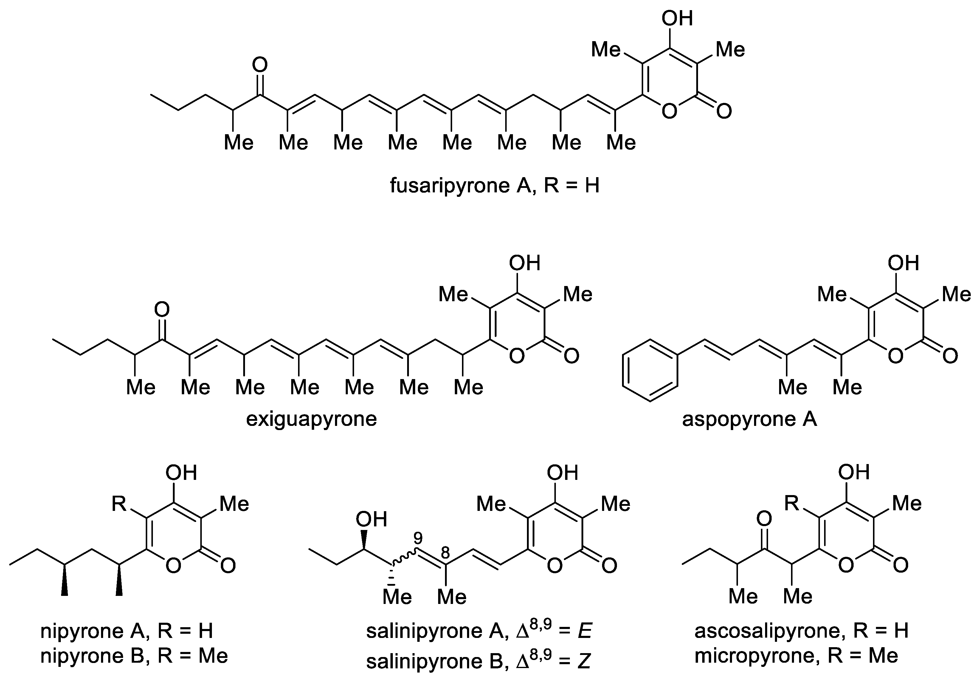 Although natural 4-hydroxy-2-pyrones are usually polyacetates, some polypropionates were found in mollusks, fungi and bacteria [44]. Fusaripyrone A and exiguapyrone were isolated from the mollusks Haminoea and contain an unusually long chain and form via a regular condensation process starting with propionyl-CoA and continuing with elongation of C3 units up to the linear C30-polypropionates after cyclization [45]. These compounds can play the role of chemical markers for these marine organisms [44]. Nipyrones A and B were isolated from a marine sponge-derived fungus Aspergillus niger and exhibit moderate antibacterial efficacy against four pathogenic bacteria [46]. Salinipyrones A and B were isolated from the marine-derived bacterium Salinispora pacifica. These metabolites are by-products of the PKS system, which is associated with the rosamicin macrolide antibiotics [47][48]. A related molecule, namely, capsulactone, was isolated from an endophytic fungus Penicillium capsulatum obtained from the leaves of Panax notoginseng and demonstrated weak antibacterial activity (Figure 4) [49].