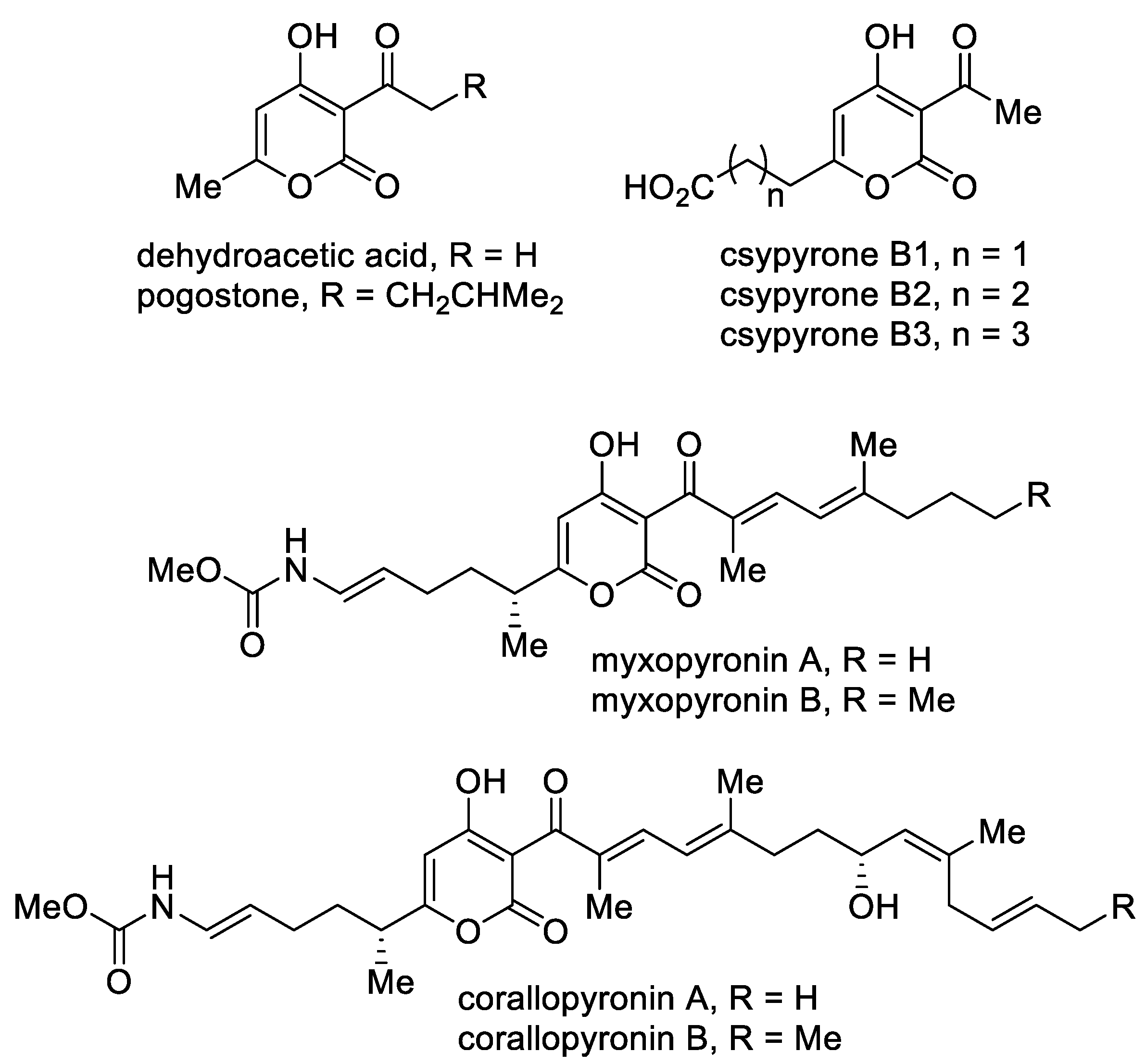 A separate group includes 3-acyl-4-hydroxy-2-pyrones (Figure 5). This class of compounds stands out due to its biological properties. The simplest of this series, namely, dehydroacetic acid, is used as a food preservative (E265) and in cosmetics due to its antibacterial and fungicidal properties [52]. A structurally similar 6-methyl-4-hydroxy-2-pyrone, namely, pogostone, which was isolated from patchouli oil, inhibits both Gram-negative and Gram-positive bacteria and demonstrates anti-cancer activities [53]. Furthermore, pogostone can be used as a repellent and insecticide [54]. Csypyrones B are 3-acetyl-α-pyrone compounds bearing the carboxylic acid side chain as the result of oxidation of the corresponding alkyl substituent and were isolated from the fungus Aspergillus oryzae [55].