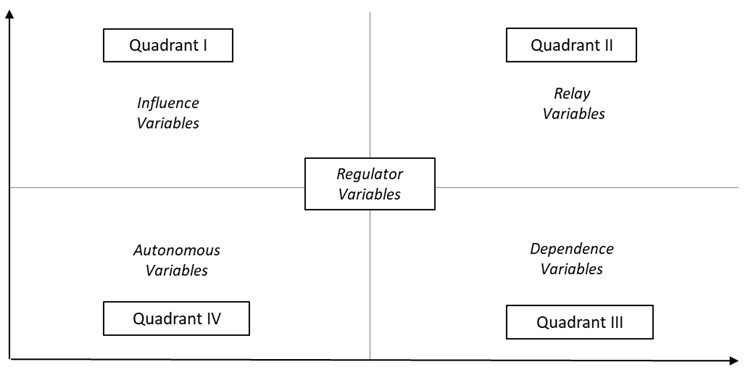 Mapping variables in MICMAC will result in four quadrants, each of which explains the status, role, and implications of each variable in the quadrant. Each variable position shows the different roles of each variable in the system. There are four main classifications for variables, namely: 1) influence variable, also called determinant variable, in quadrant I; 2) in quadrant II, relay variable 3) dependence or output variable in quadrant III; and 4) autonomous or excluded variable in quadrant IV [16]. Meanwhile, regulator variables are said to have moderate influence and dependence on the system and act as levers.