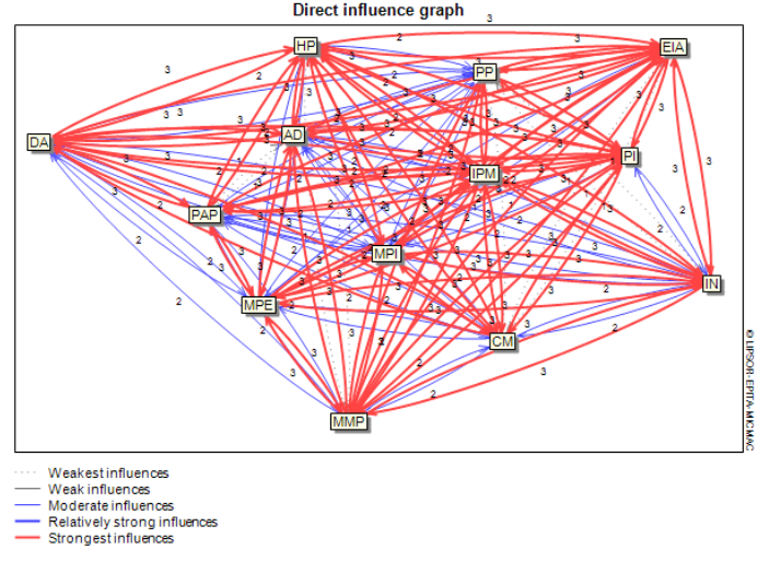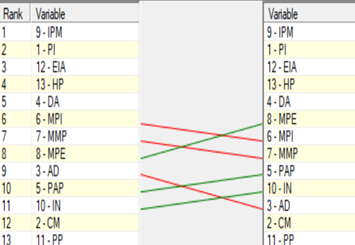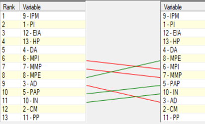 After mapping the interactions between variables, the next step is to identify changes in their ranking based on influence and dependency. This change shows where the variable rank was in the starting situation (MDI matrix) and after MDII has done a Boolean iteration [16][33].