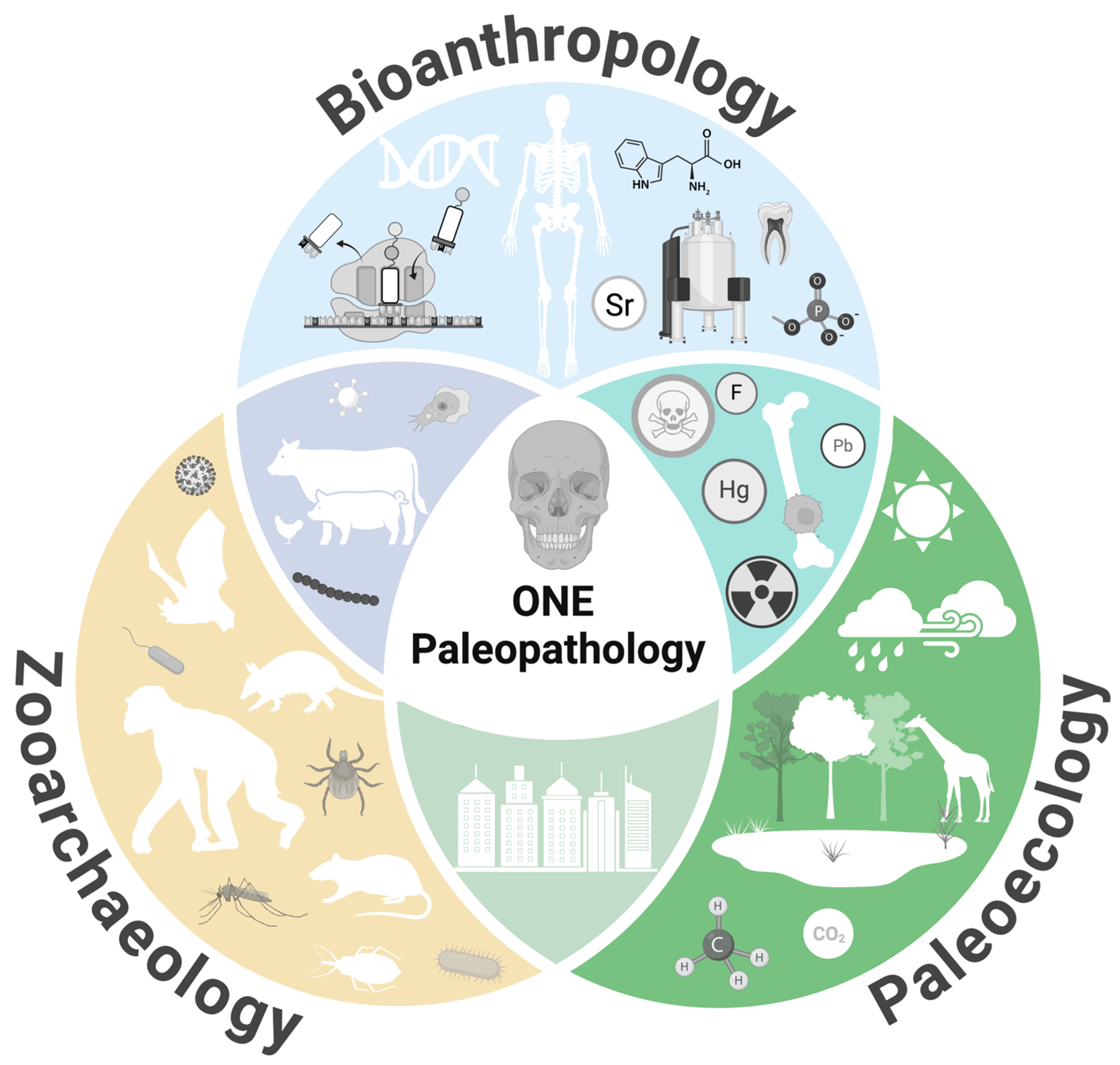 ONE Paleopathology is a holistic, interdisciplinary approach to environmental health from a deep-time perspective. It incorporates archaeological, paleoenvironmental, and paleopathological evidence to bear on contemporary public health and policy concerns: animals as sentinels, emerging and reemerging infectious diseases, antibiotic-resistant pathogens, respiratory pathogens and air quality, syndemics, migration and disease spillover, nutritional insufficiency, environmental toxicology, environmental migration, and interpersonal violence (Figure 1). Among policy and planning communities, there is growing interest in historical phenomena such as the Little Ice Age and the Medieval Warm Period, which affected health, patterns of disease, population dynamics, and had long-term impacts on human society. The past is becoming an attractive place to seek insights from completed experiments of human history as uncertainty and even panic arise about how extreme weather events, rising global temperatures, ecosystem alterations, and socio-cultural phenomena will intersect to shape the future of our planet.