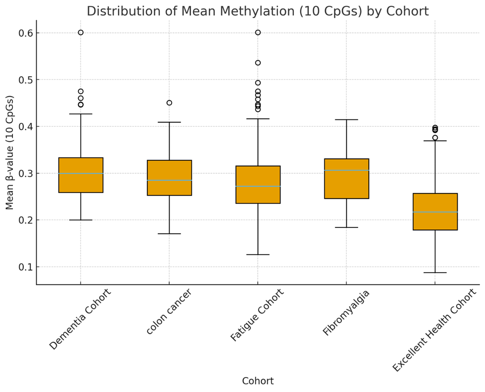Cohort comparisons reveal significant epigenetic age acceleration in individuals with fatigue, dementia, fibromyalgia, and colon cancer, ranging from +8 to +12 years compared to the Excellent Health group, which itself appears ~5 years biologically younger. This demonstrates that the 10-CpG clock is not only a precise age predictor but also sensitive to disease-related biological stress. The increased methylation variability and elevation in disease cohorts likely reflect systemic inflammation, chronic stress, and metabolic dysregulation, which accelerate methylation changes over time. These findings align with previous research but show that such insights can be achieved with a minimal, cost-effective assay.
