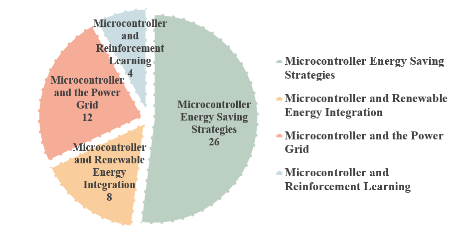 As shown in Figure 8, the total citation count for energy-saving strategies for microcontrollers is the highest. Among these highly cited publications, 26 focus on energy-saving measures, indicating that energy conservation strategies constitute a major area of interest for researchers. In contrast, literature combining reinforcement learning with energy-saving approaches has relatively low total citation counts and is the least represented, with only four studies. This phenomenon may be attributed to the fact that reinforcement learning is a relatively recent field of research, suggesting that future studies integrating reinforcement learning with microcontrollers to optimize energy efficiency still hold significant potential for development.