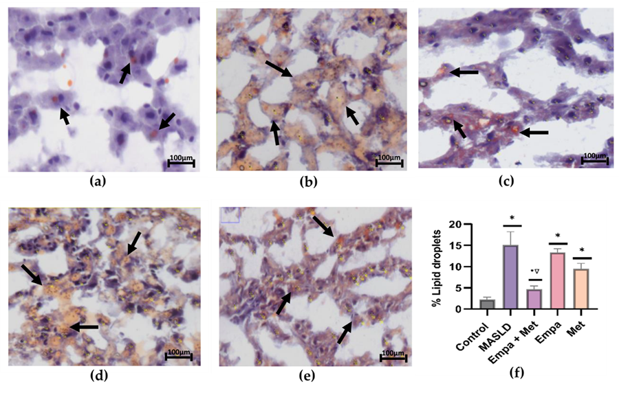 Figure 3. Analysis of the lipid accumulation in the liver: (a) control; (b) MASLD; (c) Empa+Met; (d) Empa; (e) Met; (f) quantitative analysis of lipid droplets. Empagliflozin (Empa), metformin (Met), empagliflozin + metformin (Empa+Met), metabolic dysfunction-associated steatotic liver disease (MASLD). Black arrows indicate lipid droplets. All sections oil red staining, 50× magnification. Data are expressed as mean ± SEM, n = 3, analyzed by one-way ANOVA. Statistical significance was established as * p < 0.05 vs. control; • p < 0.05 vs. MASLD, ▽ p < 0.05 vs. Empa; Δ p < 0.05 vs. Met.