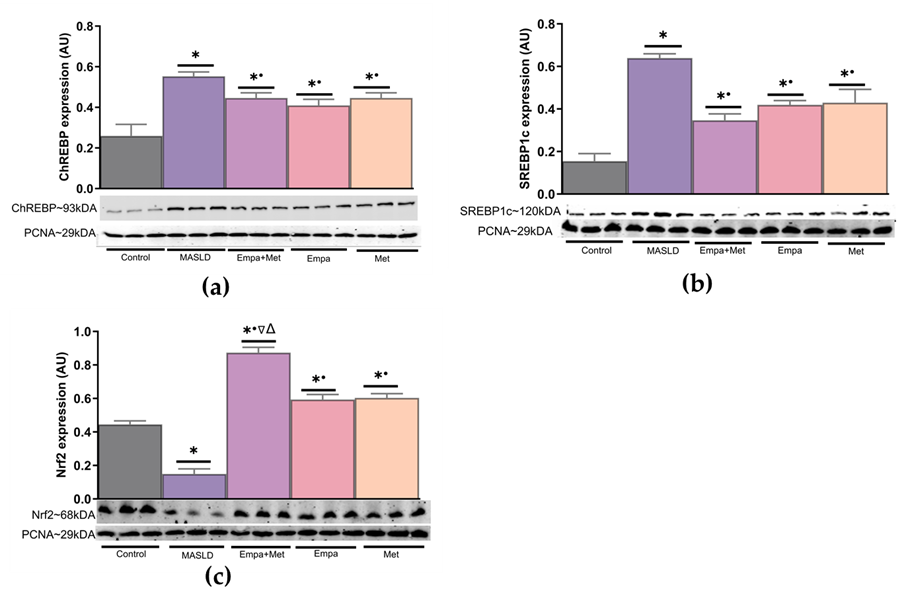 Figure 5. Expression of transcription factors associated with the modulation in the expression of proteins involved in lipid and carbohydrate metabolism and the endogenous antioxidant system in the liver. (a) ChREBP expression; (b) SREBP1c expression, and (c) Nrf2 expression. Empagliflozin (Empa), metformin (Met), empagliflozin + metformin (Empa+Met), metabolic dysfunction-associated steatotic liver disease (MASLD). For representative Western blotting, 3 randomly selected samples per group were analyzed, respectively. Data are expressed as mean ± SEM, analyzed by one-way ANOVA. Statistical significance was established as * p< 0.05 vs. control; • p < 0.05 vs. MASLD, ▽ p < 0.05 vs. Empa; Δ p < 0.05 vs. Met.