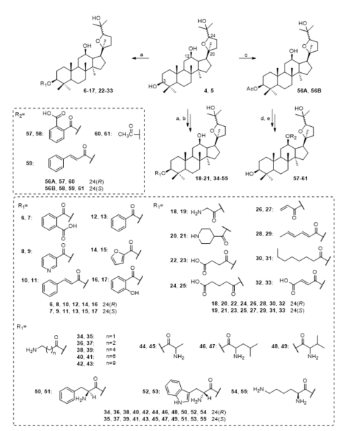 Figure 4. Synthesis of ocotillol-type derivatives 6–61. Reagents and conditions: (a) anhydrous CH2Cl2, anhydride or acids or Boc-amino acid, 1-ethyl-3(3-dimethylpropylamine) carbodiimide (EDCI), 4-dimethylaminopyridine (DMAP), r.t.; (b) trifluoroacetic acid (TFA), CH2Cl2, r.t.; (c) anhydrous pyridine, Ac2O, DMAP, r.t.; (d) anhydrous pyridine, anhydride or acid chloride, DMAP, ref.; (e) CH3OH, KOH, ref.
