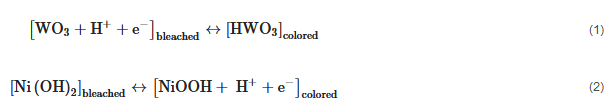 Coloration takes place as a consequence of redox reactions involving the EC films and the cations moving across the electrolyte. The most widely investigated EC materials are inorganic transition metal oxides, such as tungsten oxide (WO3), molybdenum oxide (MoO3), titanium dioxide (TiO2), and nickel oxide (NiO). EC material color, due to simultaneous cation and electron intercalation, is named "cathodic", whereas color due to cation extraction is called "anodic". The most investigated cathodic and anodic inorganic EC materials are WO), and nickel oxide (NiO). EC material color, due to simultaneous cation and electron intercalation, is named “cathodic”, whereas color due to cation extraction is called “anodic”. The most investigated cathodic and anodic inorganic EC materials are WO3 and NiO, respectively [16][17]. Their complementary behavior allows for the simultaneous coloration/bleaching of both the materials being deposited on the two opposite substrates, oppositely charged during the processes. EC materials show "double conduction" of ions and electrons; for this reason, they have been defined as "mixed conductors". When cathodic EC materials are charged with electrons, due to the external bias (in general, very low voltages, 1–5 V dc) applied to the device, they tend to attract small cations inside the complex network of channels within their structure. Following this intercalation, EC materials undergo a reversible modification of absorption. Simplified forms of the complementary redox equations are as follows [18]: and NiO, respectively [15,16]. Their complementary behavior allows for the simultaneous coloration/bleaching of both the materials being deposited on the two opposite substrates, oppositely charged during the processes. EC materials show “double conduction” of ions and electrons; for this reason, they have been defined as “mixed conductors”. When cathodic EC materials are charged with electrons, due to the external bias (in general, very low voltages, 1–5 V dc) applied to the device, they tend to attract small cations inside the complex network of channels within their structure. Following this intercalation, EC materials undergo a reversible modification of absorption. Simplified forms of the complementary redox equations are as follows [17]: