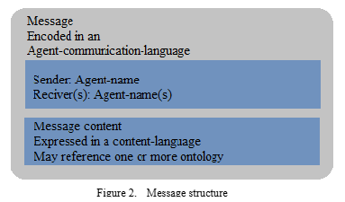 Agent-directory-entry consists of at least two key-value-pairs Agent-name and Agent-locator. Agent-name is globally unique name and Agent-locator consists of one or more transport-descriptions. Each transport-descriptions contain transport-type, transport-specific-address and zero or more transport-specific-properties.Also agent-directory-entry may contain other descriptive attributes (services offered by the agent, cost of using the agent, restrictions on using the agent, etc.)Service-directory-service provides discovering of services and a location for registration of service-directory-entries. Service-directory-entry consisting of at least one key-value-pairs: Service-name, Service-type and Service-locator. Service-locator contains one or more key-value tuples that consists of a signature type, service signature and service address. Also service-directory-entry may contain other descriptive attributes (cost of using the service, restrictions on using the service, etc.)Agent message consists of sender name, receiver names and message content. Every message must have one sender and zero or more receivers. Message content can be determined by the ontologies, in Figure 2 message structure is shown.