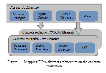 The Foundation for Intelligent Physical Agents (FIPA)is an international organization helping to promote the industry of intelligent agents. FIPA is developing specifications supporting interoperability among agents and agent-based applications. FIPA Abstract Architecture includes: Distributed computing platforms or programming languages, Messaging platforms, Security services, Directory services, and, Intermittent connectivity technologies. Also FIPA Abstract Architecture defines the following concepts: A model of services and discovery of services available to agents and other services, Message transport interoperability, Supporting various forms of ACLrepresentations, Supporting various forms of content language,and, Supporting multiple directory services representations. FIPA abstract architecture specification describes how to make the agent system, agents and services that rely on the system, in Figure 1. Mapping FIPA-abstract architecture on the concrete realization is shown.