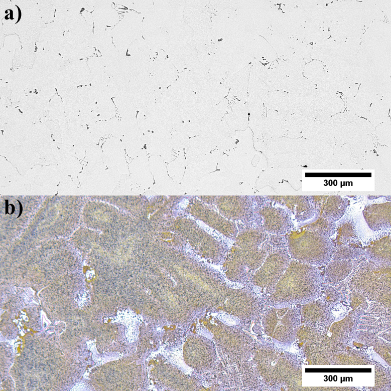 Figure 1. Microstructure of René 108: a) unetched; b) etched, LM