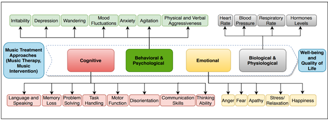 To retain the music benefits, people with dementia need to receive regular music treatment, which is approximately two to three times a week [27]. Overall, studies from the last 10 years have shown improvement in cognitive, emotional, and behavioral and psychological symptoms of PWD through music treatment approaches, resulting in a better quality of life and wellbeing (Figure 1).