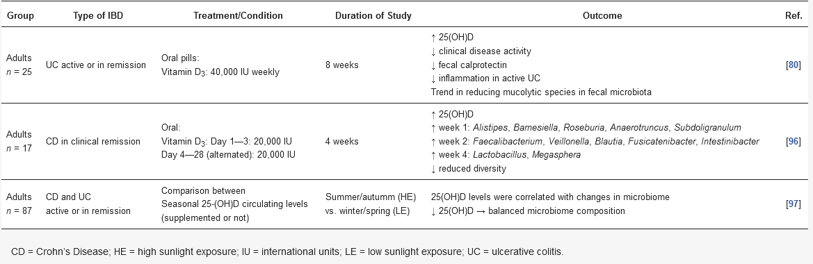 Table 1. Summary of published human studies outcomes evaluating vitamin D3 and its modulation of microbiota in inflammatory bowel disease.