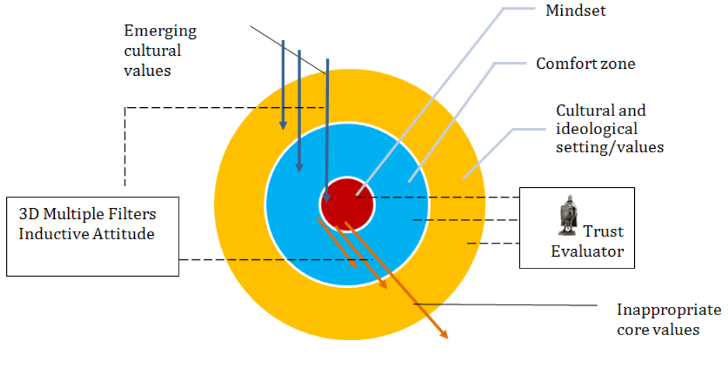 The blue arrows represent the inflow of the entering information or values, whereas the orange arrows indicate the outflow of inappropriate information or values. Both flows are driven by the 3D multi-filtering process [7] and the inductive attitude [8]. Inductive attitude and the 3D multi-filter process facilitate trust-building exercises for comfort zone values. By reaching the critical mass, the emerging value is allowed to enter the core mindset by the trust evaluator. In reverse, a core value can lose its trust level then the evaluator forces it out of the nucleus. The trust evaluator, which can be understood as the cost-benefit judgment of the individual, plays the guarding role during the whole filtering process, at any place and any time.