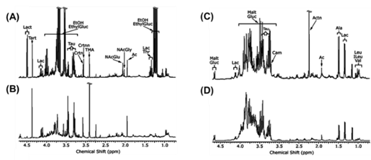 Figure 4. 1H NMR spectrum of (A) mice urine with alcohol treatment; (B) mice urine with control; (C) mice liver with alcohol treatment; (D) mice liver with control. Solution state NMR experiments (400 MHz). The metabolites assignment of 1H NMR spectra data in alcohol-treated mice are annotated. EthylGluc, ethylglucuronide; EtOH, alcohol; Lac, lactate; Ac, acetate; NAcGly, N-acetylglycine; NAcGlu, N-acetylglutamine; TMA, trimethylamine; Crtnn, creatinine; Crtn, creatine; Tau, taurine; Tart, tartrate; Lact, lactose; Malt, maltose; Carn, carnitine; Actn, acetone; Ala, alanine; Leu, Leucine; ILeu, isoleucine; Val, valine. Adapted from reference [43] Copyright at 2008 Elsevier Inc.