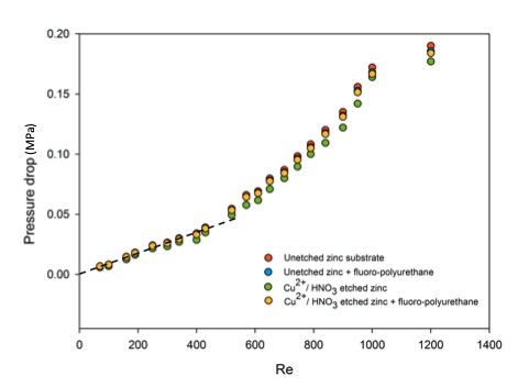 - etched zinc + fluoropolyurethane drag reduction rate at different channel heights and Reynolds numbers.