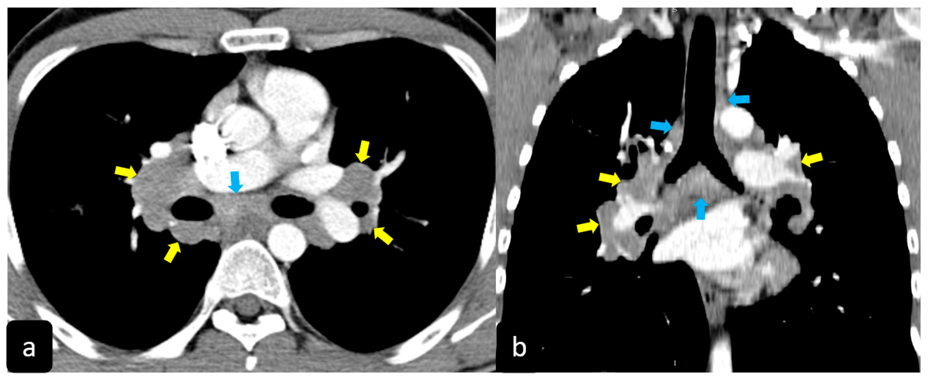 Figure 3. Axial (a) and coronal (b) CT scans in a patient with pulmonary sarcoidosis show the typical characteristic hilar ((yellow arrows) and mediastinal (blue arrows) bilateral lymphadenopathy.