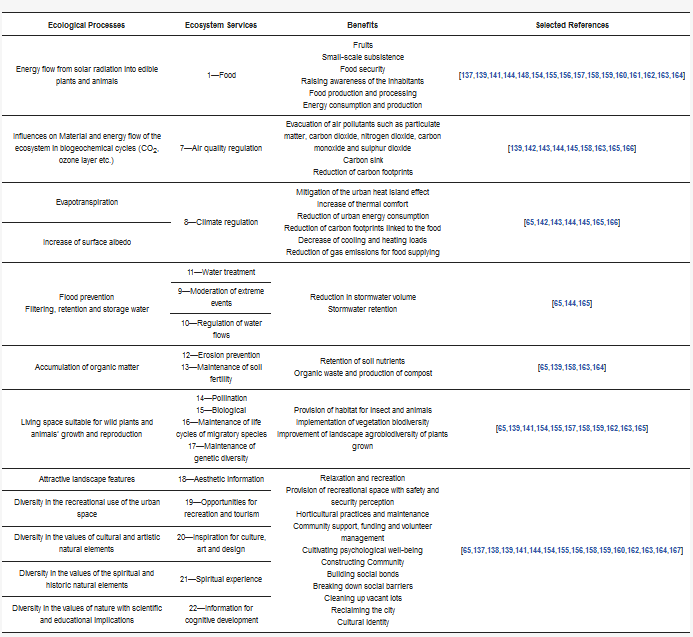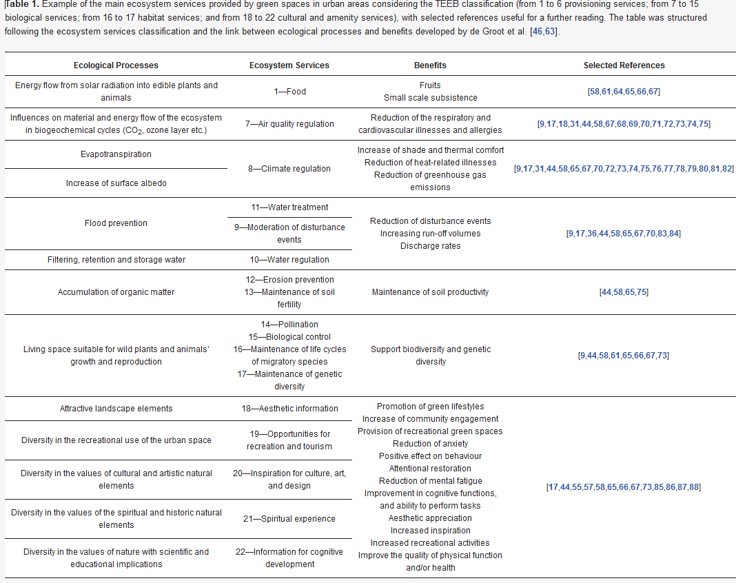 Table 1. Example of the main ecosystem services provided by green spaces in urban areas considering the TEEB classification (from 1 to 6 provisioning services; from 7 to 15 biological services; from 16 to 17 habitat services; and from 18 to 22 cultural and amenity services), with selected references useful for a further reading. The table was structured following the ecosystem services classification and the link between ecological processes and benefits developed by de Groot et al. [46][56].