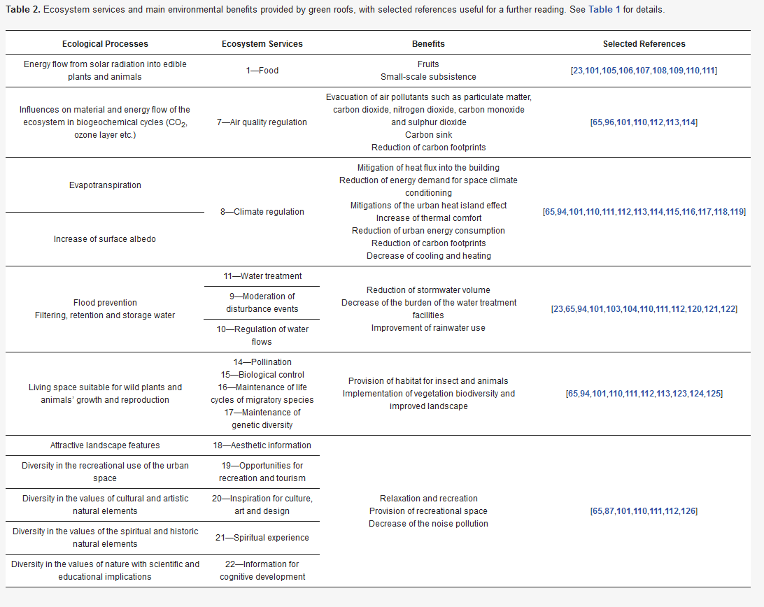 | Evapotranspiration | 8—Climate regulation | Mitigation of heat flux into the building Reduction of energy demand for space climate conditioning Mitigations of the urban heat island effect Increase of thermal comfort Reduction of urban energy consumption Reduction of carbon footprints Decrease of cooling and heating |