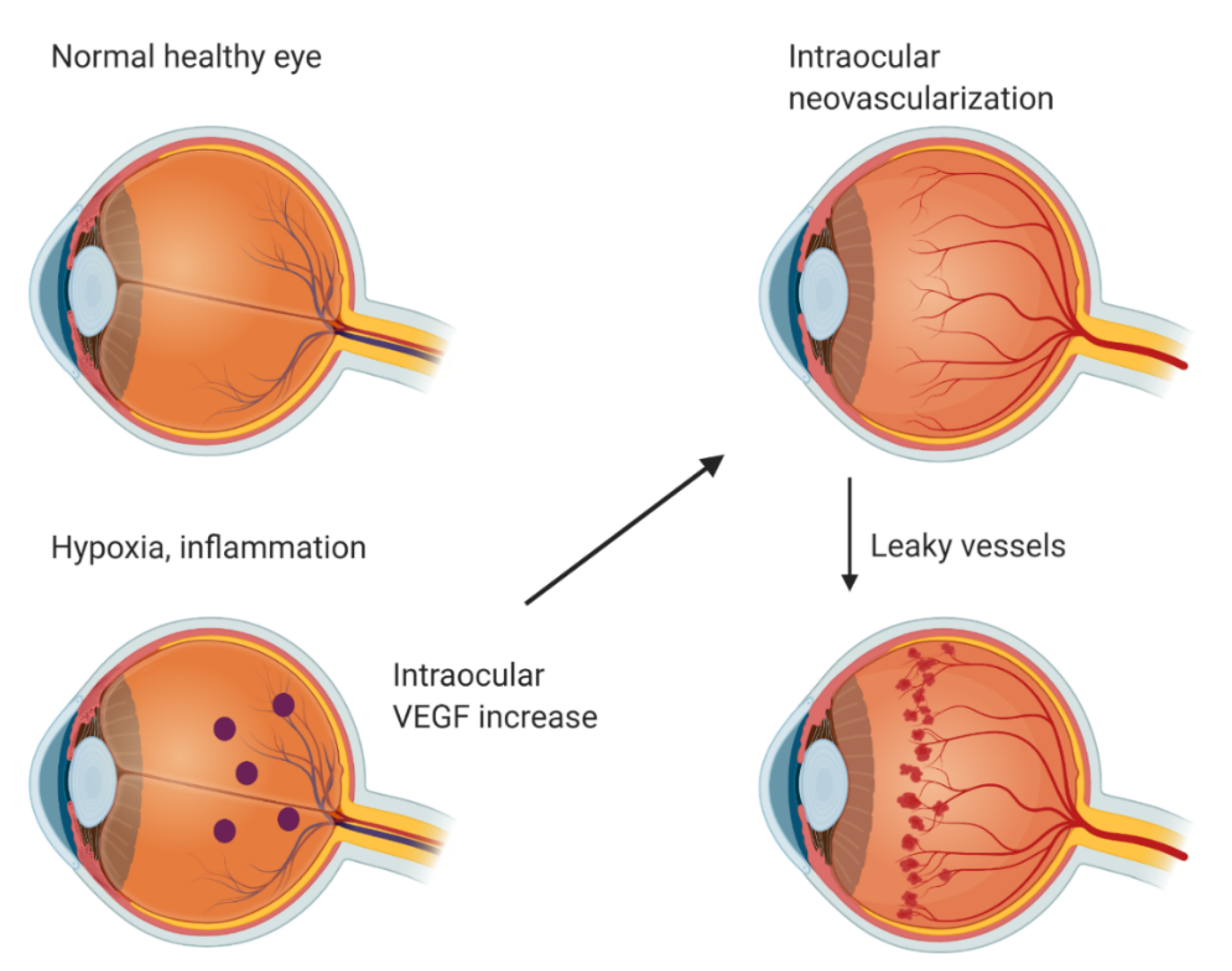 Figure 1. Intraocular neovascularization. Hypoxia or inflammation upregulates VEGF expression, which leads to intraocular neovascularization and, ultimately, leaky vessels. Created with BioRender.com.
