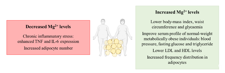 Finally, other studies have focused on the impact of magnesium modulation in the adipocyte. It has been known for a long time that the adipocyte is not only a simple storage depot for body energy, but in fact an endocrine organ playing a very relevant role in obesity [48]. Interestingly, magnesium supplementation has been shown to result in a shift by increasing the frequency distribution of large adipocytes whereas magnesium deficiency did not modify adipocyte size but increased their number in in vivo models of obesity [49]. This is far more relevant considering that the age-related changes in adipose tissue lipid storage may lead to the proliferation of adipocytes in order to sustain lipid accumulation, making more difficult the loss of adipose tissue in elder patients [49]. In fact, the adipose tissue expansion by adipocyte proliferation has been characterized to be feasible for promoting obesity development [50] and magnesium levels appear to modulate this adipocyte proliferation.