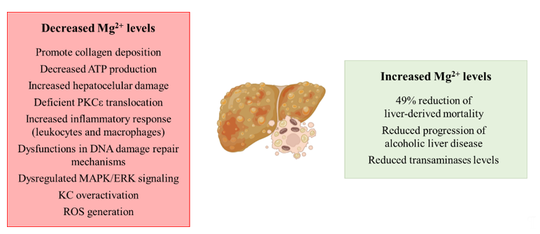 The spread of unhealthy lifestyle habits, together with inadequate nutritional behavior, are making NAFLD and the pathologies comprised in its spectrum the leading cause of chronic liver disease worldwide. Although, to date, the role of Mg2+ in the development of NASH has not been explored in depth, a clinical study showed a protective effect of Mg2+ intake in patients with liver diseases. Remarkably, an increased intake of 100 mg (25–33% increase of the daily recommended intake) showed a 49% reduction of liver-derived mortality [25], suggesting a possible role of the cation depletion in the development of liver diseases. Related to cirrhosis, the most severe stage of the pathologies that comprise the spectrum of NAFLD, decreased hepatic magnesium levels have been reported to promote collagen deposition in the liver, a hallmark of liver fibrosis [26,27][26][27]. The role of the cation is of relevance in the mitochondria from hepatocytes, where low intramitochondrial magnesium content has been described in cirrhosis with the subsequent decreased ATP production and increased hepatocellular damage [28]. The role of protein kinase Cε (PKCε) and its relationship with Mg2+ has also been characterized, as hypomagnesemia leads to a deficient PKCε translocation and subsequent fibrinogen and collagen deposition [29]. There is an existing link between low intrahepatic magnesium levels and an increased inflammatory response, as under low hepatic Mg2+ content, an over-activation of leukocytes and macrophages has been characterized, together with the recruitment of more inflammatory cells to the liver [30]. Moreover, the supplementation of this cation has been proposed as anti-cirrhotic therapy, because in vivo studies have demonstrated its protective effect [31].
