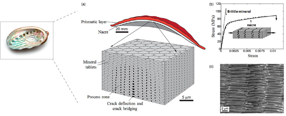 Figure 2. Nacre from mollusc shell (a) three-dimensional nanostructure of nacre organized in brick wall fashion, (b) tensile stress-strain curves for pure aragonite and nacre, (c) SEM image of the fracture surface of nacre with crack propagation deflected along the interfaces (reprinted with permission from Barthelat et al. 2015 [4]).