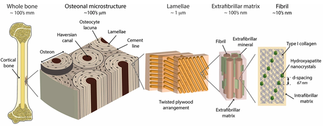 Figure 1. Hierarchical structure of human cortical bone with the presence of hydroxyapatite mineral nanocrystals (reprinted with permission from Zimmermann et al. 2016 [40]).